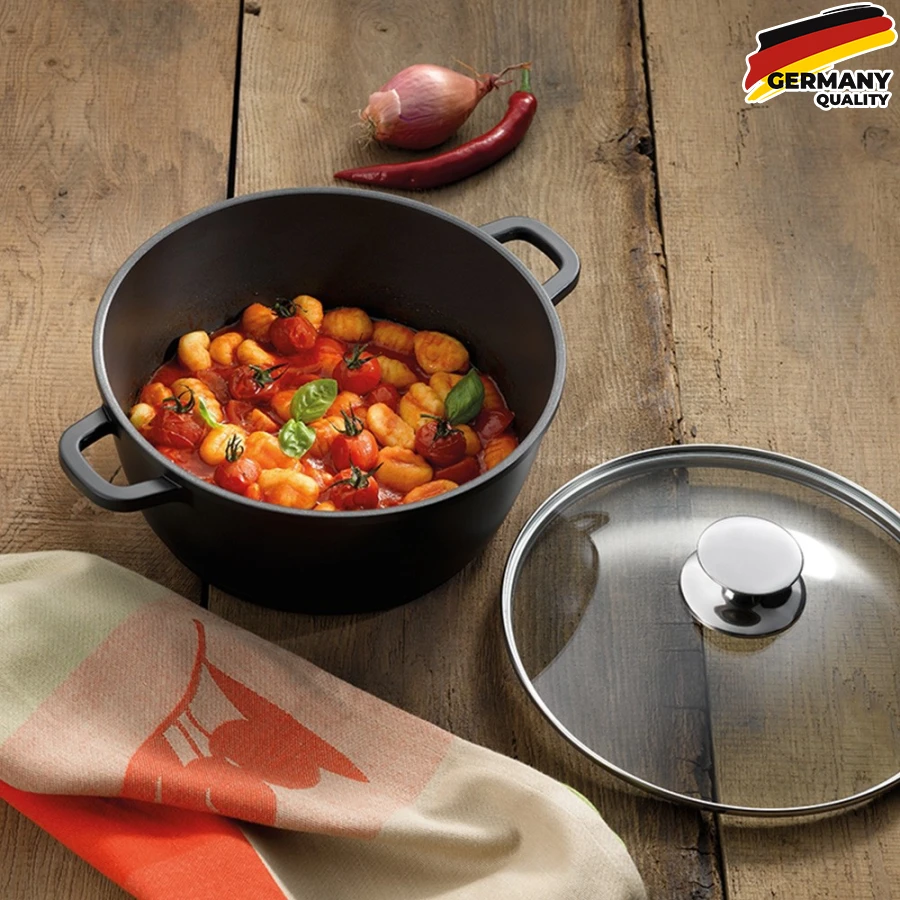 Німецький виробник посуду та начиння для кухні KELA, представляє стильну і практичну каструля з кришкою KELA Kerros з литого алюмінію із 3-шаровим антипригарним покриттям Greblon-Non-Stick-C3 + від компанії Weilburger (Німеччина). Це покриття відоме своїми видатними антипригарними властивостями, високою стійкістю до стирання і подряпин. Їжа, в каструлі з таким покриттям, не пригорає, готується швидко і не вимагає особливого догляду. Вже після першого використання ви будете дивуватися, як могли обходитися без каструлі KELA Kerros раніше. Товщина стінок - 2 мм, дна - 5 мм. Каструля швидко нагрівається та довго тримає тепло, заощаджуючи енерговитрати. Прозора скляна кришка зі зручною ручкою із нержавіючої сталі захищає від втрати тепла та дозволяє контролювати процес приготування. Каструля підходить для всіх типів плит, включаючи індукційні. Можна використовувати в духовці при нагріванні до 180 ° С. Каструлі KELA Kerros можна мити в посудомийній машині. Висота - 10,5 см, діаметр - 24 см, об'єм - 3,2 л.