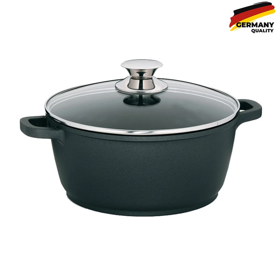 Каструля з кришкою KELA Kerros з литого алюмінію із 3-шаровим антипригарним покриттям Greblon-Non-Stick-C3 + від компанії Weilburger (Німеччина). Це покриття відоме своїми видатними антипригарними властивостями, високою стійкістю до стирання та подряпин. Товщина стінок - 2 мм, дна - 5 мм. Прозора скляна кришка з ручкою з нержавіючої сталі захищає від втрати тепла і дозволяє контролювати процес приготування. Каструля підходить для всіх типів плит, в т.ч. індукційних. Можна використовувати в духовці при нагріванні до 180°С. Каструлі KELA Kerros можна мити в посудомийній машині. Висота – 10,5 см, діаметр - 24 см, об'єм - 4,5 л.