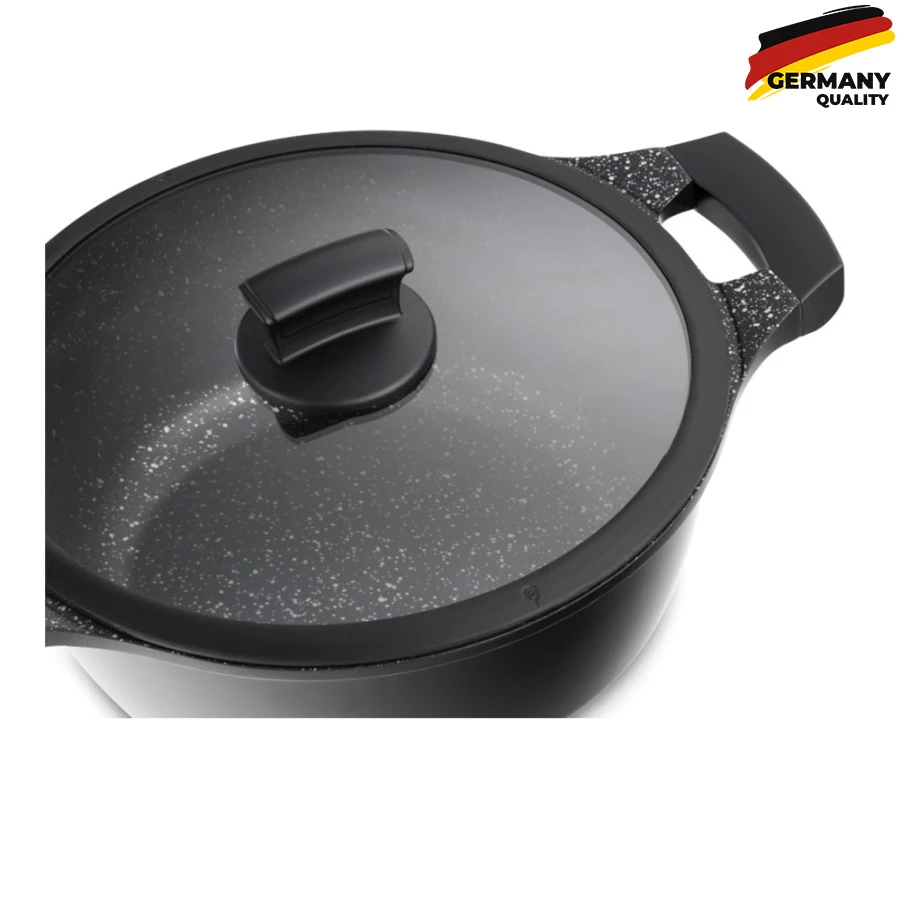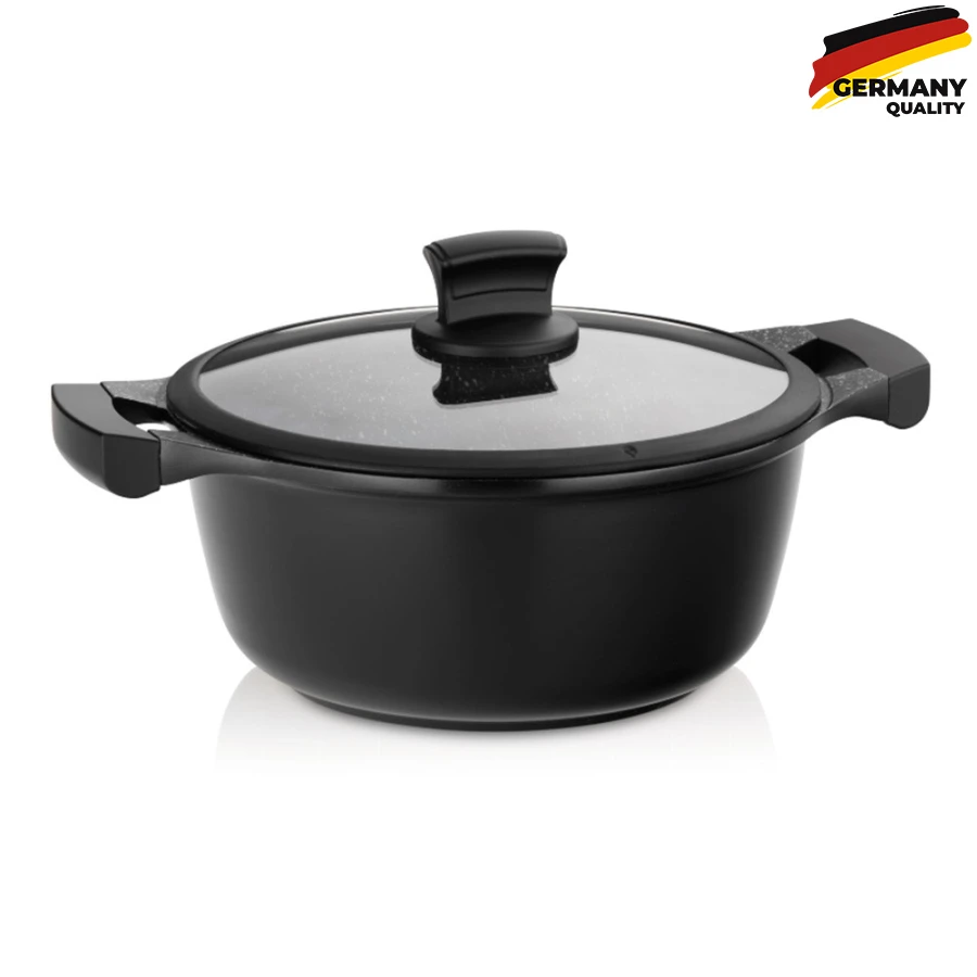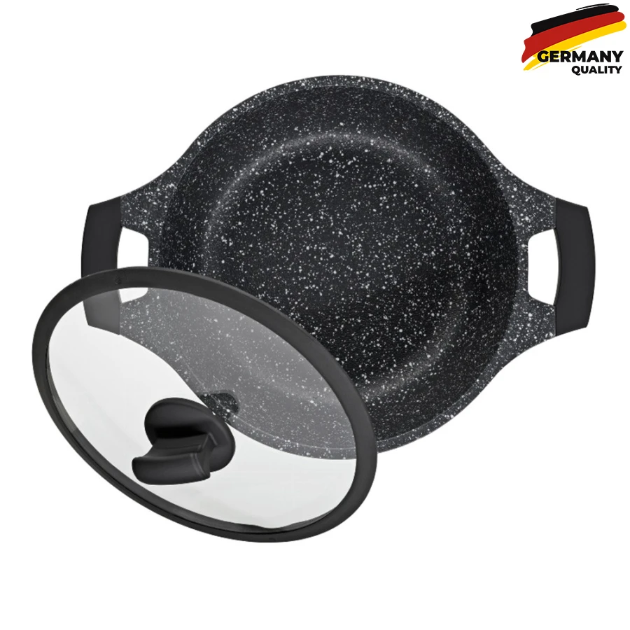 Німецький виробник посуду та начиння для кухні KELA, представляє сучасну і багатофункціональну каструлю з кришкою KELA Stella Nova. Каструля зроблена з литого алюмінію зі спеціальним шорстким антипригарним покриттям. Рівномірний розподіл жиру по всій поверхні дна каструлі завдяки технології Oil Control System. Каструлі ідеальна для складних перших страв з попередніми обсмажуванням інгредієнтів, гасіння, приготування з мінімальною кількістю води і жиру. Протипригарне напилення зручно при варінні каш, рагу, макаронів, густих супів. Ручки з бакеліту з покриттям софт-тач. Скляна кришка має зручну ручку та два отвори для випуску пари. Суцільне дно з нержавіючої сталі не тільки доповнює дизайн каструлі, але й економить енергію (короткий час розігріву та рівномірний розподіл тепла). Підходить для віх типів плит, включаючи індукційні. Можна використовувати в духовці при нагріванні до 180 °C.