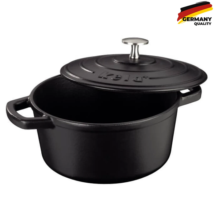 Німецький виробник посуду та начиння для кухні KELA, представляє дуже модну і довговічну каструлю з кришкою KELA Calido. Вона ідеально підходить як для обсмажування (до 300°C), так і для тривалого тушкування м'яса у власному соку. У ній ви зможете готувати рагу і густі супи, тушкувати голубці і тефтелі, експериментувати з соусами. Також цей посуд не боїться неприємних запахів і сторонніх смаків, не потребує попередньої підготовки перед першим застосуванням. Її досить вимити з миючими засобом. Чавунна кришка має зручну ручку. Підходить для всіх джерел тепла, включаючи індукційні. Ця каструля є частиною великої серії посуду!