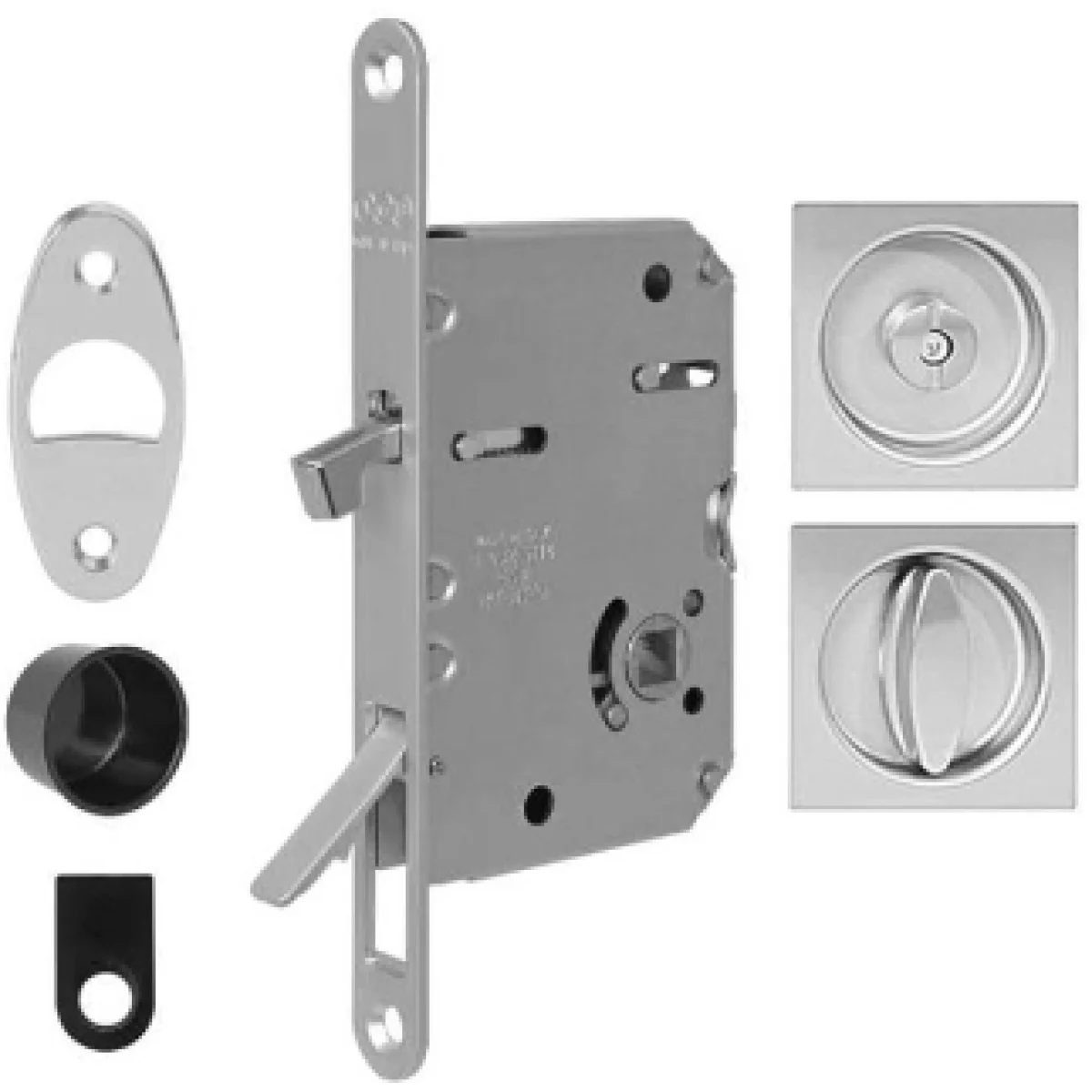 Монтувати замок бажано до встановлення дверей на напрямні — це дозволяє точно сформувати посадочне місце й забезпечити безперешкодний хід полотна. Рекомендується перевірити правильність виставлення каретки розсувної системи перед остаточним затягуванням кріплення. Для естетичної сумісності обирайте ручки та накладки у відтінку Хром матовий.