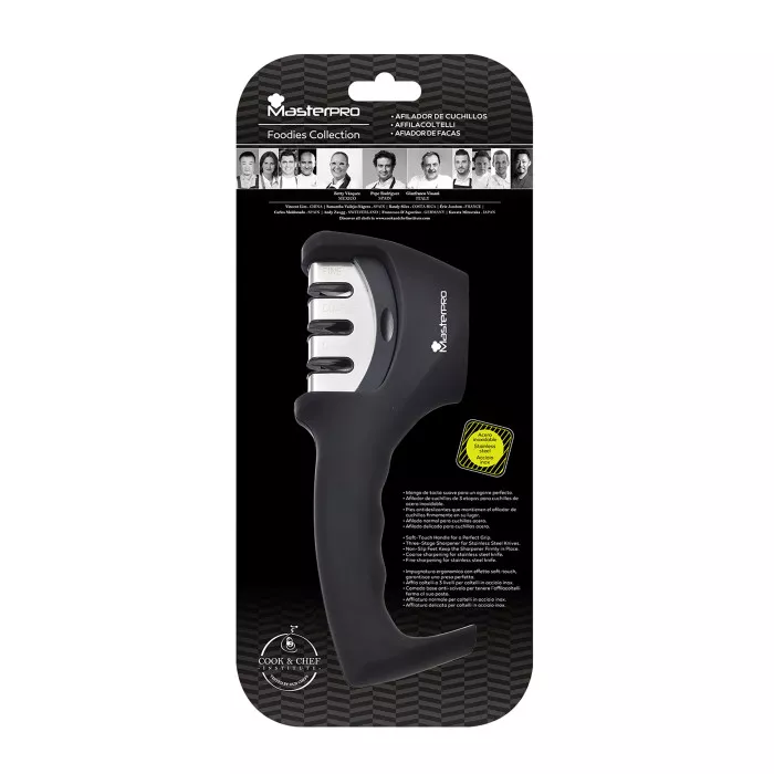 Точило для ножів MasterPro Foodies collection, розміром 19X7.8X7 см, виготовлене з міцного пластику, забезпечує легке і швидке відновлення гостроти ваших ножів. Його стильний чорний і металічний дизайн робить його ідеальним вибором для будь-якої сучасної кухні. Незважаючи на свою ефективність, миття в посудомийній машині не рекомендується для цього продукту.]]>