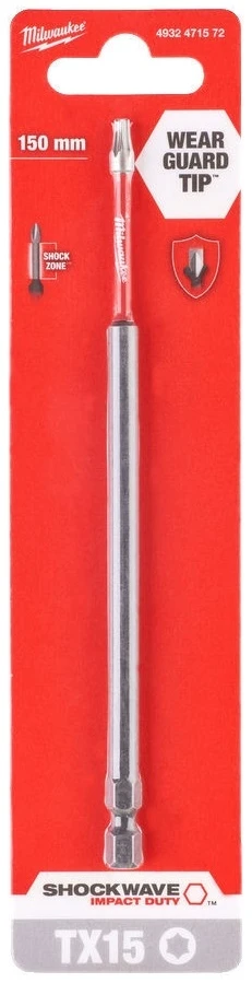 Біта Milwaukee Shockwave TX15 × 150 мм (4932471572) — подовжена ударостійка біта Torx 15 довжиною 150 мм для глибоких отворів і важкодоступних місць. Виготовлена зі сталі S2 з гнучкою зоною Shockzone™, що гасить удари та збільшує ресурс до 50 разів. Лазерно-загартований наконечник Wear Guard Tip™ гарантує точне утримання шурупа без зриву. Шестигранна основа 1/4" ідеально фіксується в магнітному тримачі. Вага 34 г — незамінна для точного монтажу меблів, регулювання фурнітури та електроустановки.