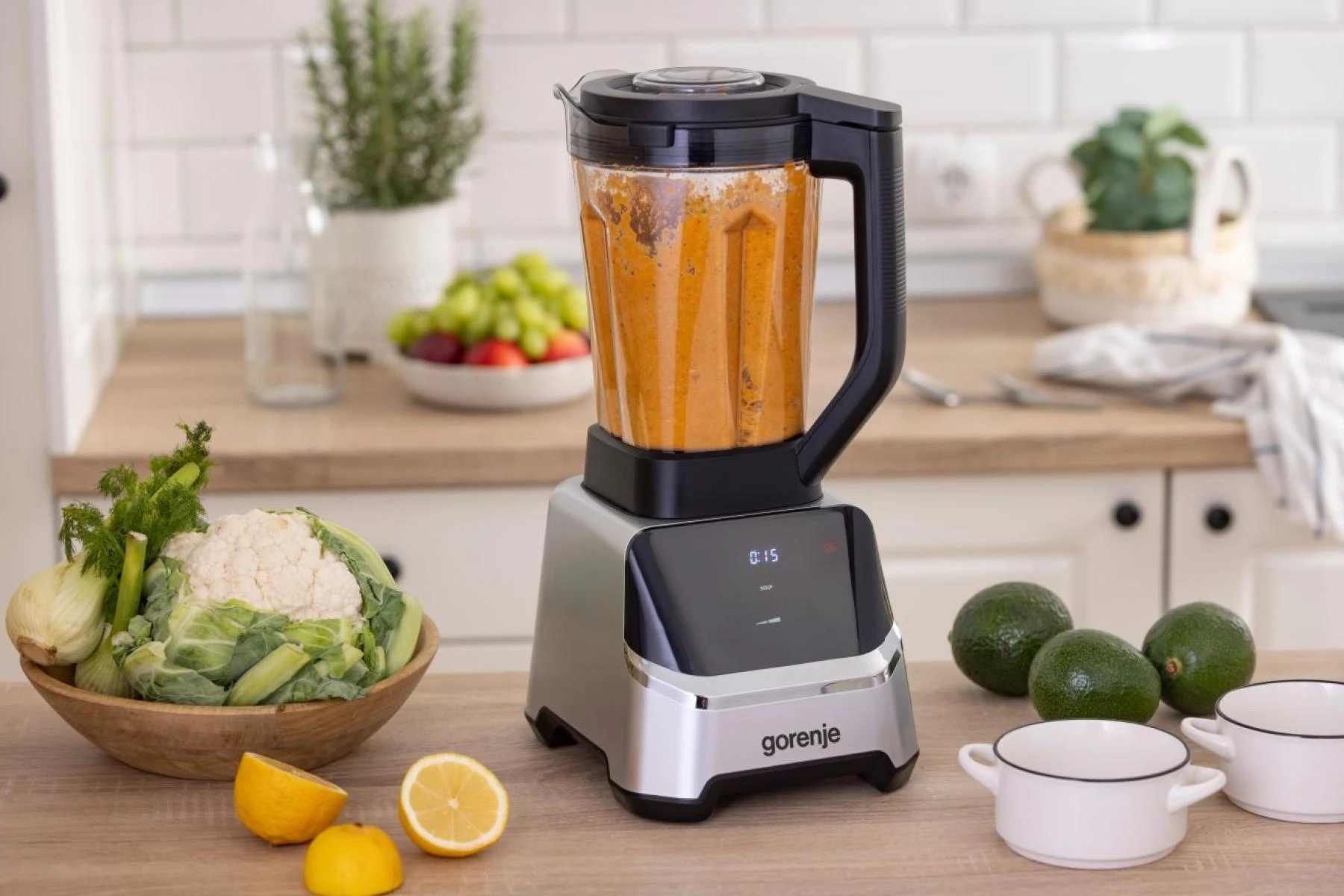 Gorenje BP1500DE — потужний стаціонарний блендер 1500 Вт із 2-літровою чашею з тритану та світлодіодним дисплеєм. Оснащений 6-лопасним ножем із нержавіючої сталі, він легко подрібнює лід, горіхи, овочі та готує смузі або пюре. Має 7 автоматичних програм, імпульсний режим і систему захисту від перегріву. Зручна конструкція спрощує очищення, а гумові ніжки забезпечують стійкість під час роботи.