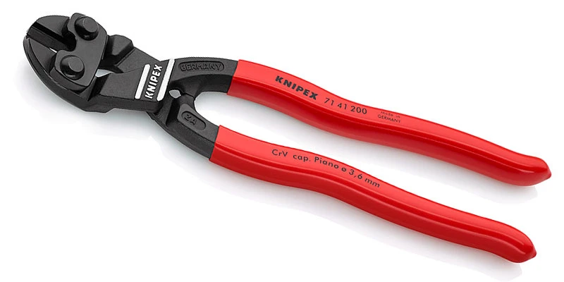 Компактний болторіз KNIPEX CoBolt 71-41-200 забезпечує потужне різання навіть у вузьких просторах завдяки довжині всього 200 мм. Він ефективно ріже болти, дріт, заклепки та арматуру діаметром до 6 мм. Прогумовані руків’я зменшують втому та забезпечують надійний контроль. Леза виготовлені зі сталі високої твердості для довгого терміну служби. Ідеальний вибір для точних та серійних робіт у обмежених місцях.