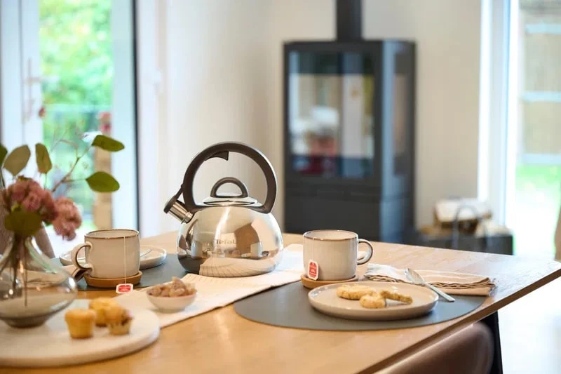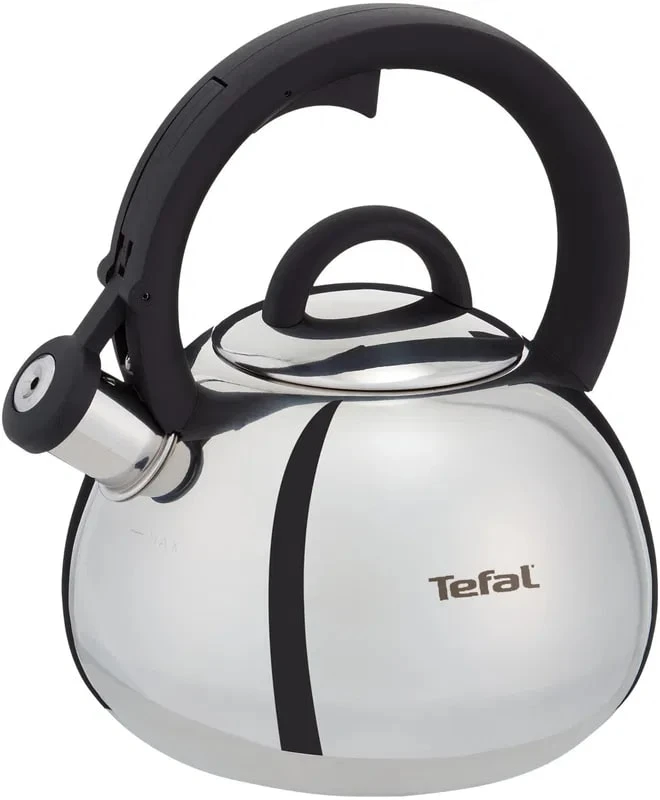 Tefal Duetto+ (N4180310) — чайник зі свистком на 2.5 л з нержавіючої сталі з чорними бакелітовими вставками. Ручка й носик з термоізоляцією, свисток з важелем для відкриття однією рукою, сумісність з усіма типами плит (включно з індукційними). Дно з потовщеним шаром для рівномірного нагрівання, полірована поверхня легко миється. Класичний французький чайник для щоденного використання.