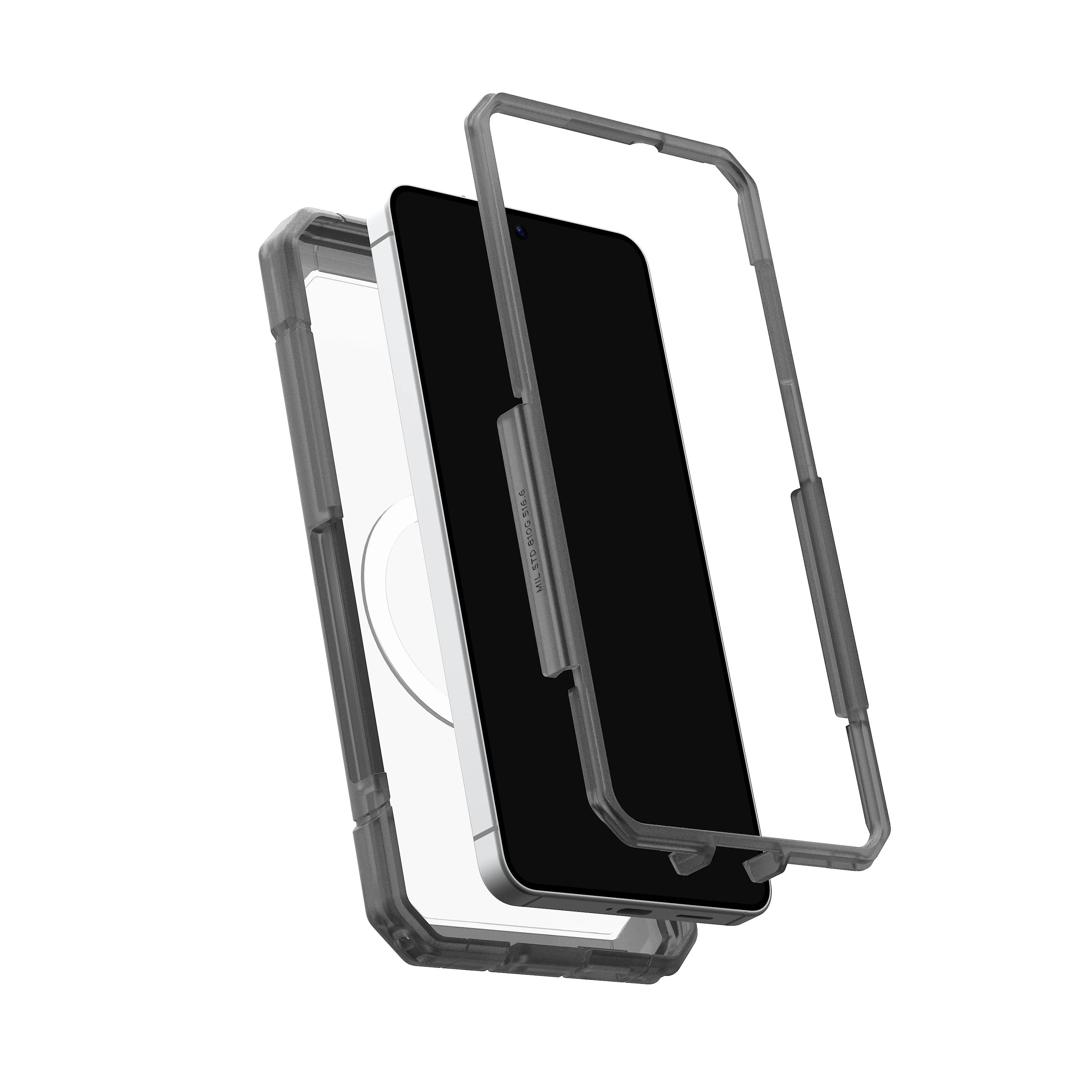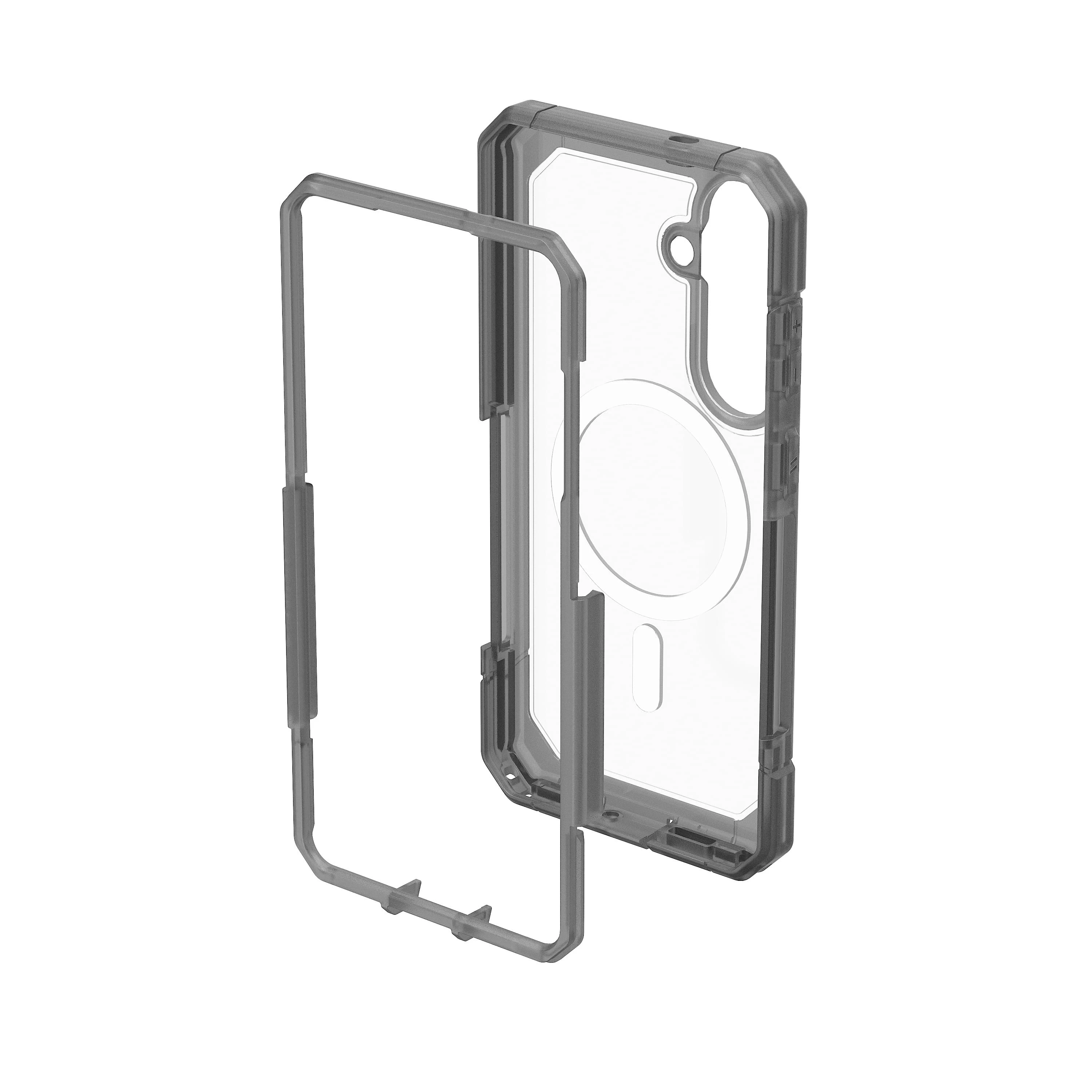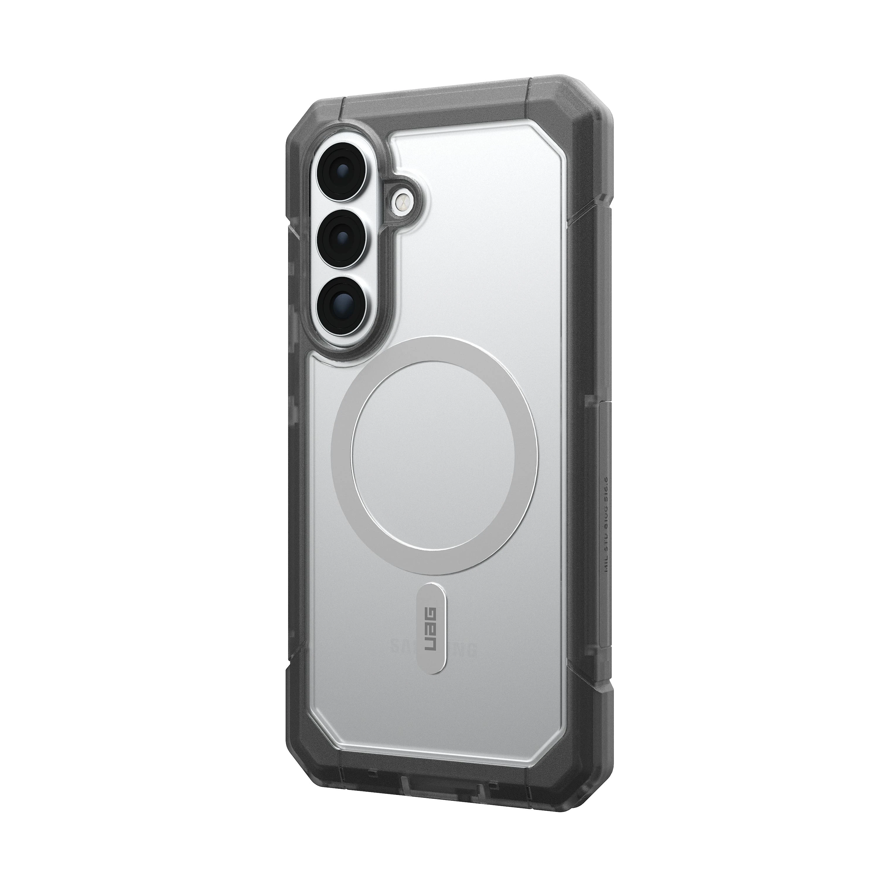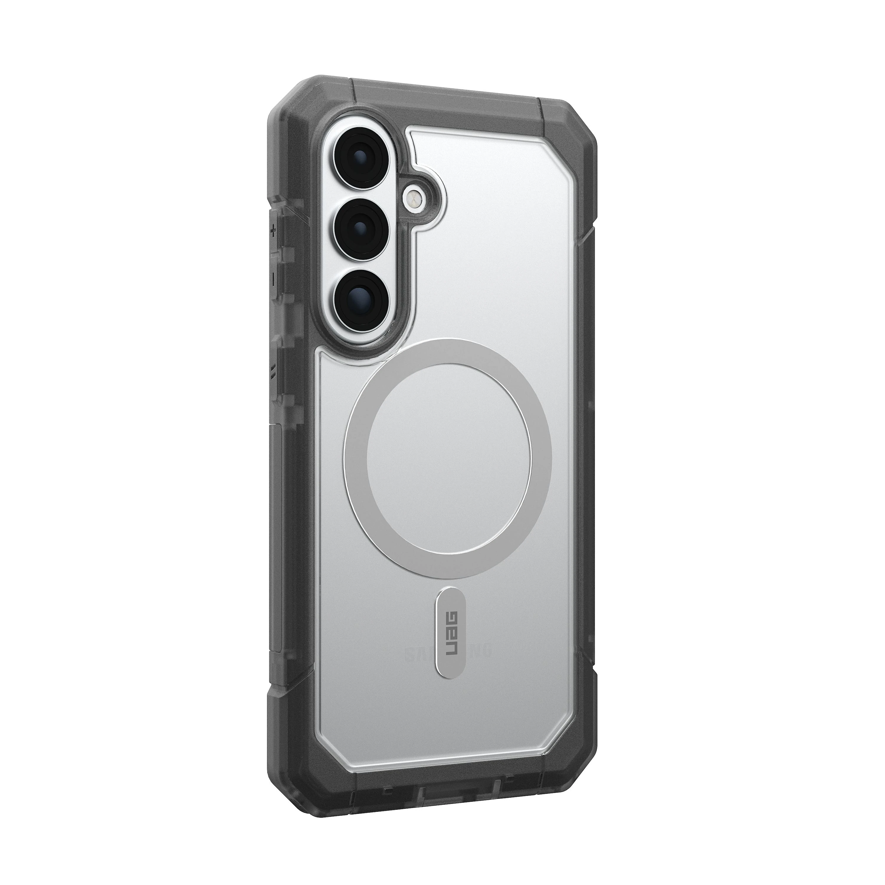 UAG Trooper with Magnet Clear/Ash for Samsung Galaxy S26+ — захищений чохол із прозорою, напівполіпропіленовою оболонкою та вбудованим магнітним модулем для бездротової зарядки. Конструкція двох шарів поєднує тверду зовнішню обшивку й м’яке внутрішнє ядро для якісної амортизації ударів. Забезпечує тестовану падіннєву стійкість відповідно до військового стандарту до ~9,1 м. Підтримує роботу з бездротовим заряджанням та більшістю аксесуарів MagSafe.