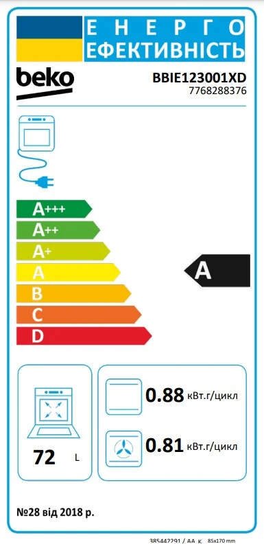 Духова шафа Beko електрична, 72л, A, конвекція, нерж