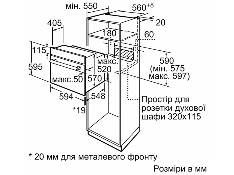 - Розміри ніші для вбудовування (ВхШхГ), см 57.5 - 59.7 x 56 - 56.8 x 55