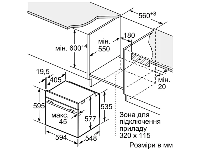 - Розміри ніші для вбудовування (ВхШхГ), см 585-595 x 560-568 x 550 мм