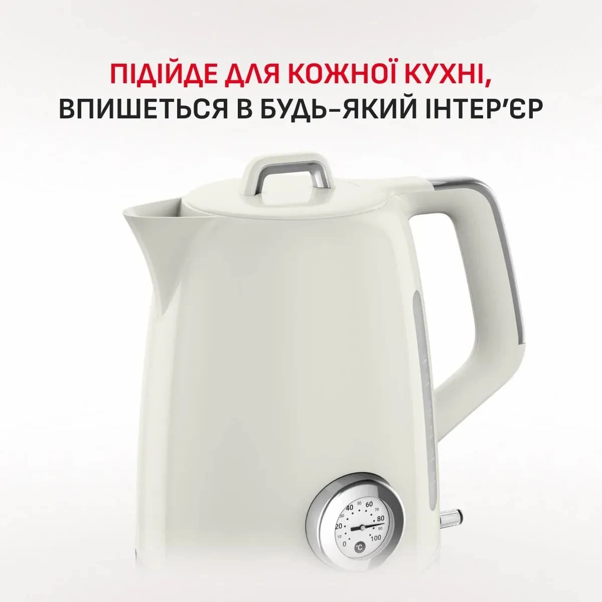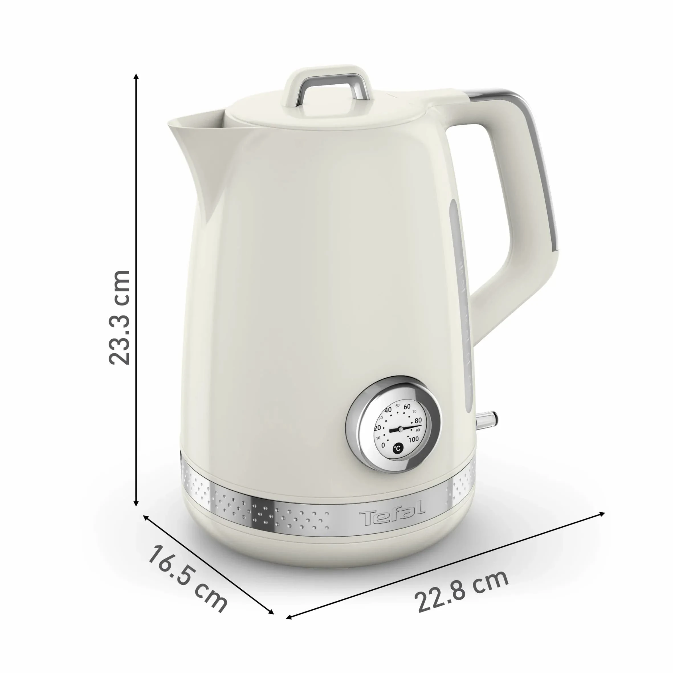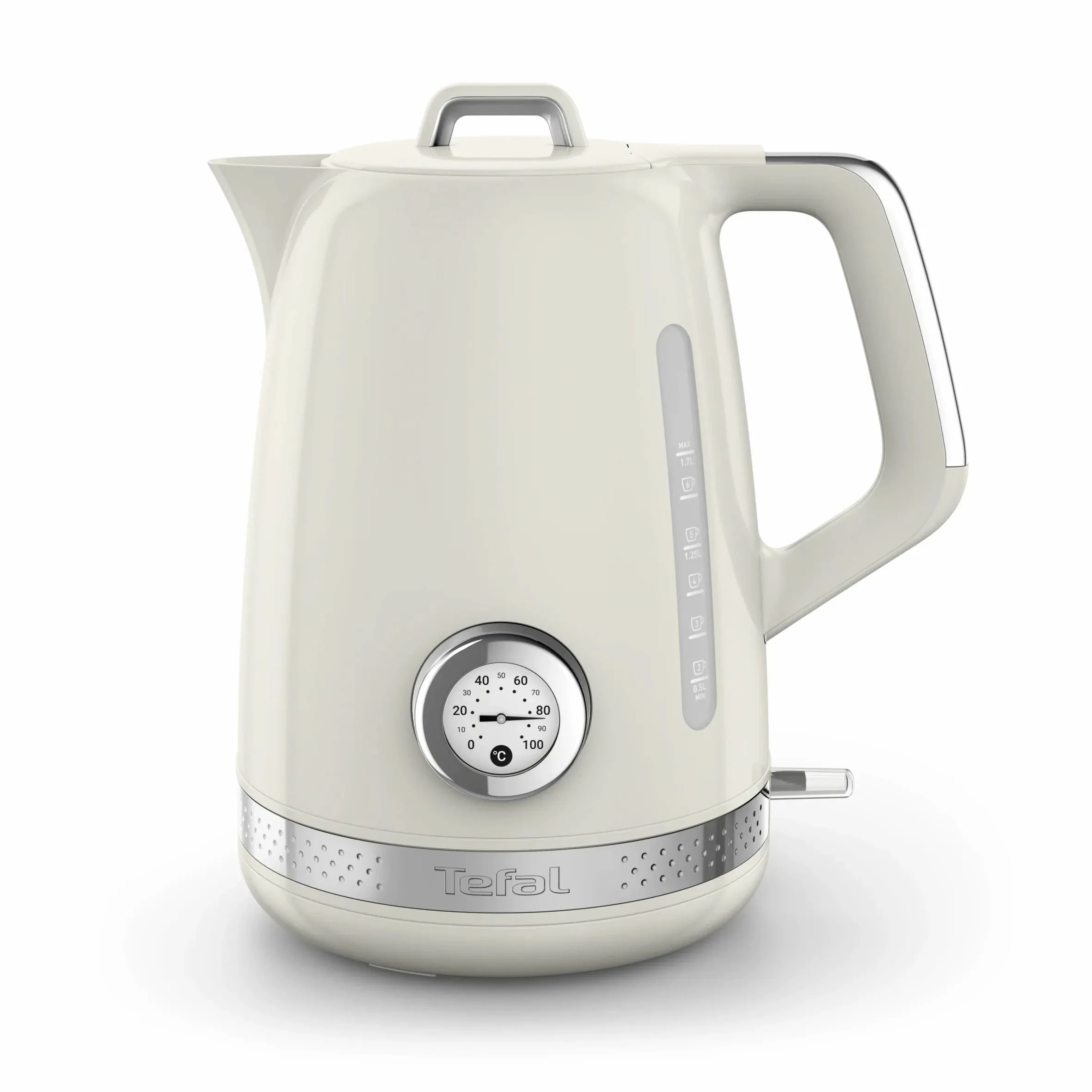 Електрочайник Tefal Soleil+ поєднує сучасну функціональність із ретро-дизайном у бежевому кольорі. Об’єм 1.7 л дозволяє кип’ятити воду для кількох чашок напоїв за один цикл. Модель оснащена вбудованим термометром для контролю температури води та надійним термостатом Strix для безпечної роботи. Відкидна кришка й індикатор рівня води спрощують наповнення та контроль об’єму. Знімний фільтр від накипу допомагає підтримувати чистоту води під час щоденного використання.