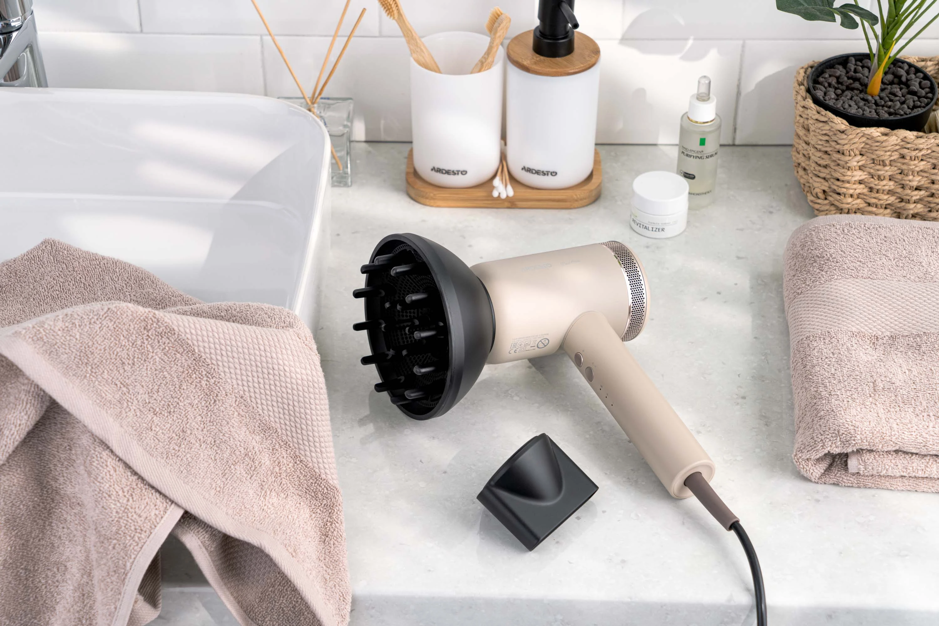 Фен ARDESTO Pearl Cream HD-Y702PERL елегантного бежевого кольору поєднує функціональність, стильний дизайн і зручність щодо використання. Пристрій потужністю 1 500–1 800 Вт оснащено високопродуктивним BLDC двигуном, який обертається зі швидкістю до 90 000 об/хв, створюючи потужний потік повітря. Це дає змогу швидко висушити навіть густе волосся без перегрівання. Фен має насадку-концентратор і дифузор. Насадка-концентратор спрямовує потік повітря від коренів до кінчиків волосся для надання гладкості. Дифузор допомагає зберегти природну текстуру волосся. Передбачено 2 швидкісних і 3 температурних режими. Фен має функцію іонізації, яка зменшує статичну електрику. Зафіксувати зачіску допоможе функція Cool Shot.