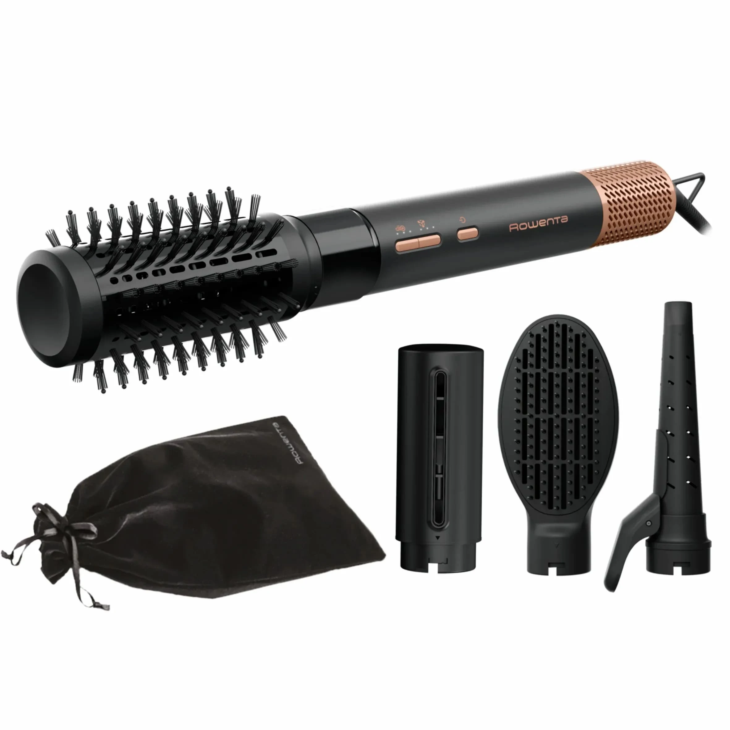 Rowenta Air Shape — фен-щітка з цифровим мотором та набором насадок для створення різних стилів укладки. Потік повітря до 150 км/год забезпечує швидке висушування та точний контроль. Керамічне покриття та іонізація сприяють збереженню гладкості волосся та зменшенню статичного ефекту. Пристрій дає можливість формувати як повсякденні, так і більш виразні образи.