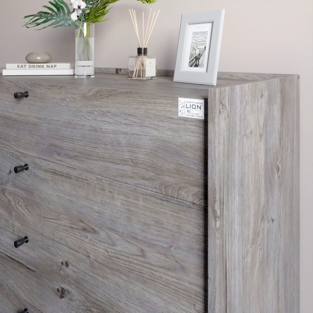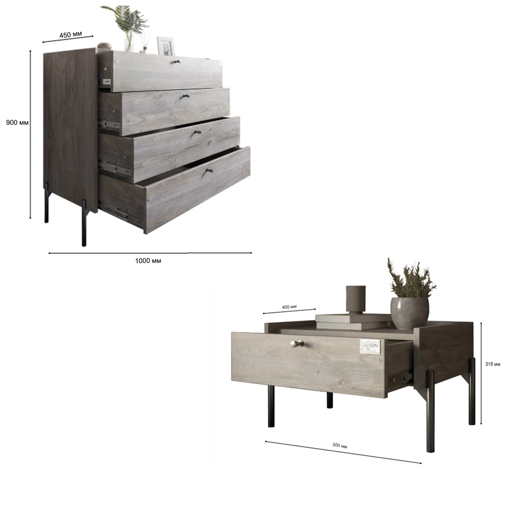 Изготовленный из высококачественного ЛДСП SWISS KRONO, этот комплект мебели гарантирует долговечность и стойкость к любым механическим повреждениям. Инновационные механизмы открывания ящиков обеспечивают легкость в использовании, а металлические ножки придают комплекту стабильность и современный вид. Кромка, защищающая края, повышает износостойкость и эстетическую привлекательность, позволяя мебели сохранять свой безупречный вид на долгие годы. Выберите LION Wood для создания гармоничного пространства в вашей спальне!