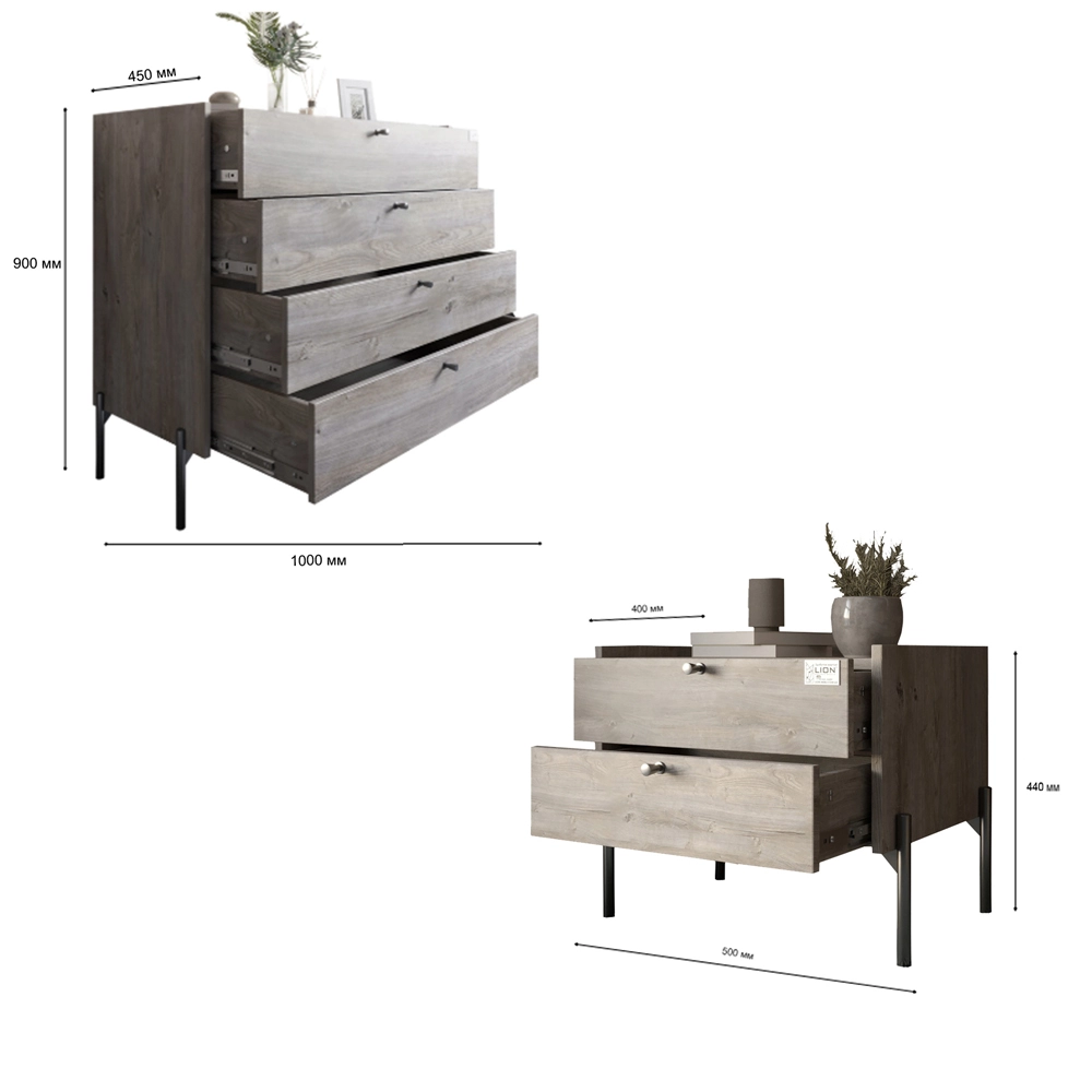 Создайте уют в вашей спальне с комплектом мебели LION Wood, сочетающей в себе современный дизайн и максимальную практичность. Этот набор включает в себя все необходимое для организации пространства: стильную ТВ-тумбу с двумя дверцами и ящиками, комод, тумбу прикроватную и другую тумбу с тремя ящиками. Изготовленный в актуальном скандинавском стиле этот комплект подарит вашей комнате свежий вид, подчеркивая элегантность вашего интерьера. Металлические ножки придают мебели стабильность, а современные механизмы открывания ящиков гарантируют удобство использования. Кромка 2 мм не только защищает края от повреждений, но повышает эстетическую привлекательность изделий. Выберите LION Wood для создания гармоничного и стильного пространства в вашей спальне!