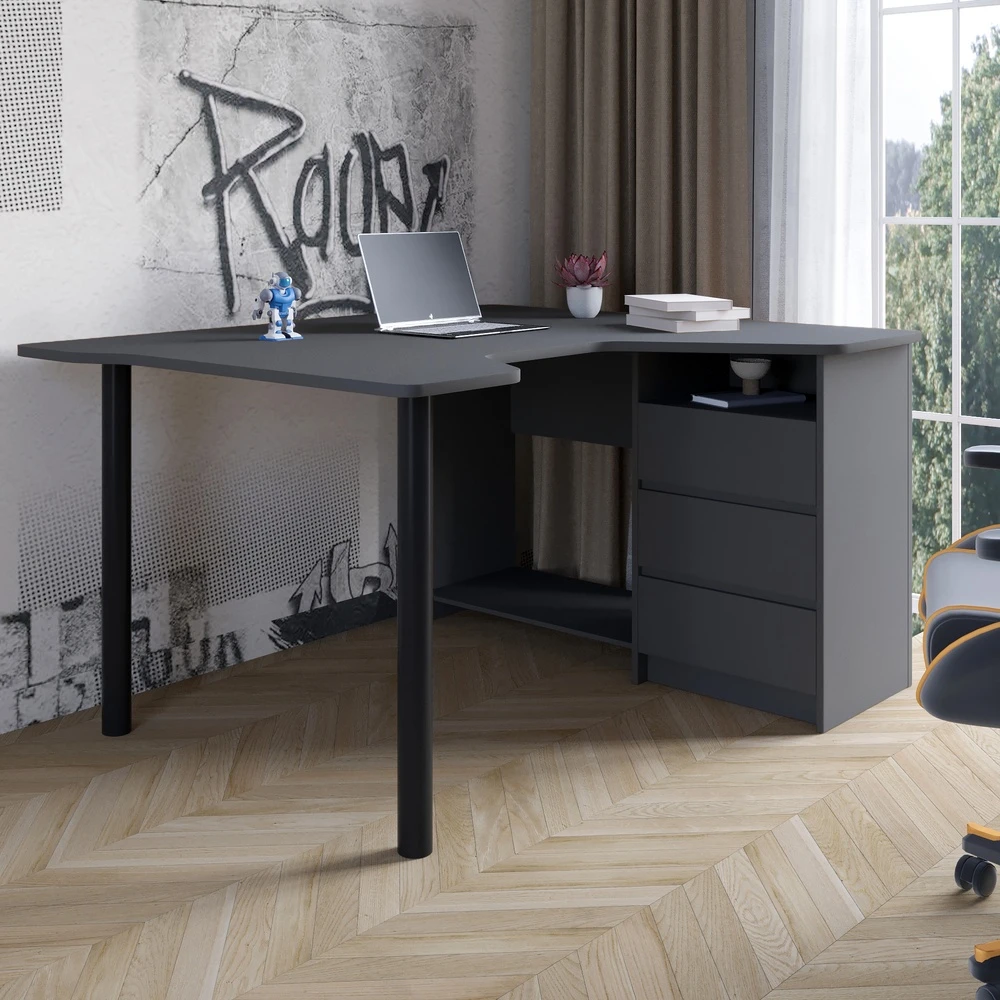 Геймерский компьютерный стол LION Буст угловой с выдвижными ящиками Антрацит (LION-041449) ТОПLION Буст — это современный угловой геймерский стол, созданный для максимальной продуктивности и удобства во время игры или работы. Стильный цвет Антрацит и лаконичный дизайн придают интерьеру современный вид, а функциональные выдвижные ящики помогают поддерживать порядок на рабочей поверхности. Благодаря эргономичной форме стол идеально подходит для геймеров, стримеров и офисных пользователей.Модель изготовлена из высококачественной ламинированной ДСП производства Swiss Krono, что обеспечивает прочность, долговечность и приятную текстуру поверхности. Три удобных выдвижных ящика с телескопическими направляющими гарантируют плавное и тихое открытие. Благодаря своим размерам стол легко размещает два монитора, клавиатуру, колонки и игровые аксессуары — всё, что нужно для идеальной геймерской зоны.Преимущества модели LION БустЭргономичная угловая конструкция позволяет эффективно использовать пространство комнаты.Современный дизайн в цвете Антрацит отлично сочетается с геймерским или офисным интерьером.Прочная столешница из ламинированной ДСП от Swiss Krono гарантирует долговечность и приятную поверхность.Наличие 3 выдвижных ящиков помогает удобно хранить аксессуары, документы или периферию.Телескопические направляющие обеспечивают плавную и бесшумную работу ящиков.Оптимальные размеры (ширина 140 см, глубина 120 см, высота 74,5 см) обеспечивают комфорт даже при длительном использовании.Характеристики товараВысота, см — 74,5Глубина, см — 120Тип направляющих для выдвижных ящиков — ТелескопическиеЦвет — АнтрацитШирина, см — 140Тип — Геймерский компьютерный столМатериал столешницы — Ламинированная ДСПКоличество выдвижных ящиков — 3Особенности — Выдвижные ящикиПроизводитель ДСП — Swiss Krono
