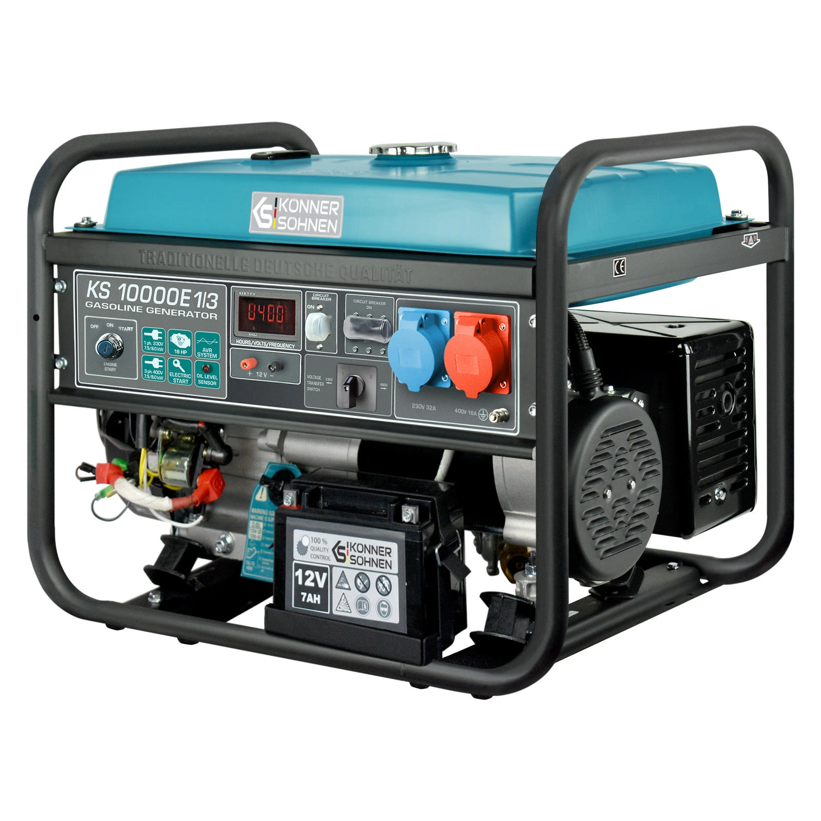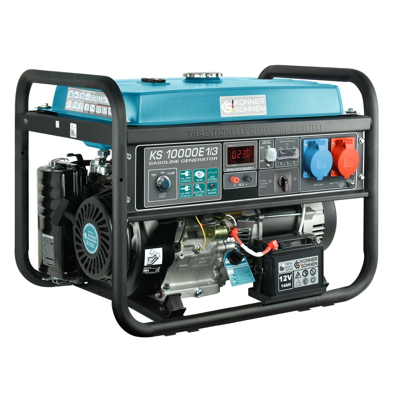 Бензиновий генератор Könner & Söhnen KS 10000E 1/3 призначений для однофазного та трифазного електропостачання. Модель оснащена системою VTS, що дозволяє перемикати режим роботи між 230 В і 400 В. Синхронний альтернатор із мідною обмоткою та система AVR забезпечують стабільні параметри напруги. Електростартер і місткий паливний бак спрощують експлуатацію під час тривалих робіт.