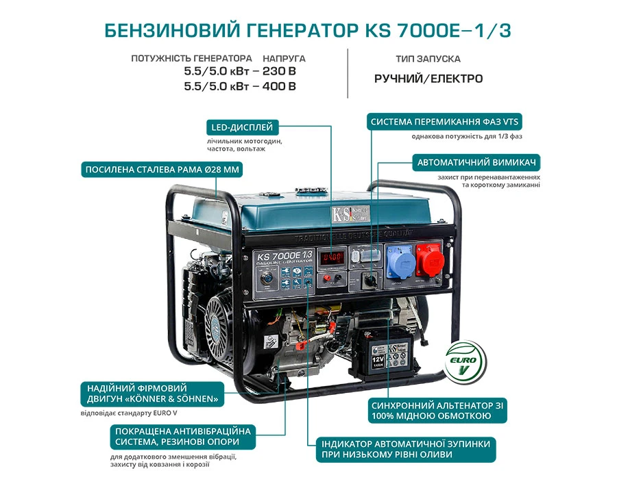 Генератор бензиновий Konner&Sohnen KS 7000E 1/3, 230/400В, 5.5/5.0кВт, LED-дисплей, електростартер,