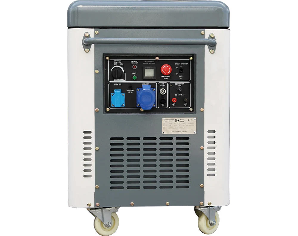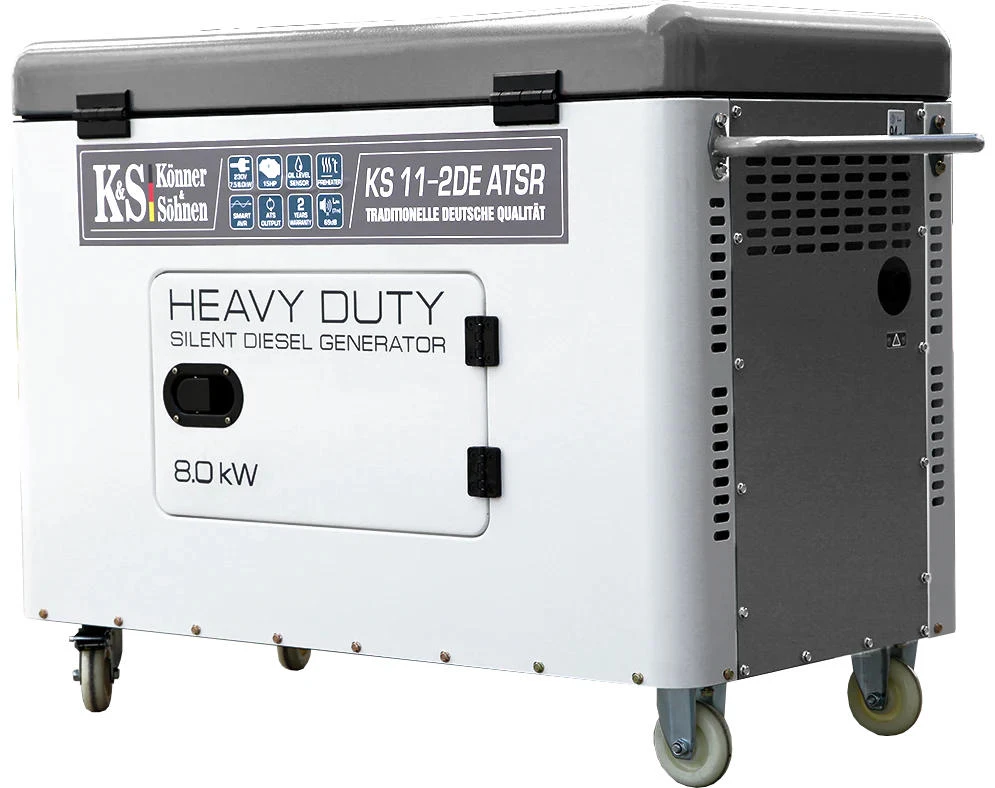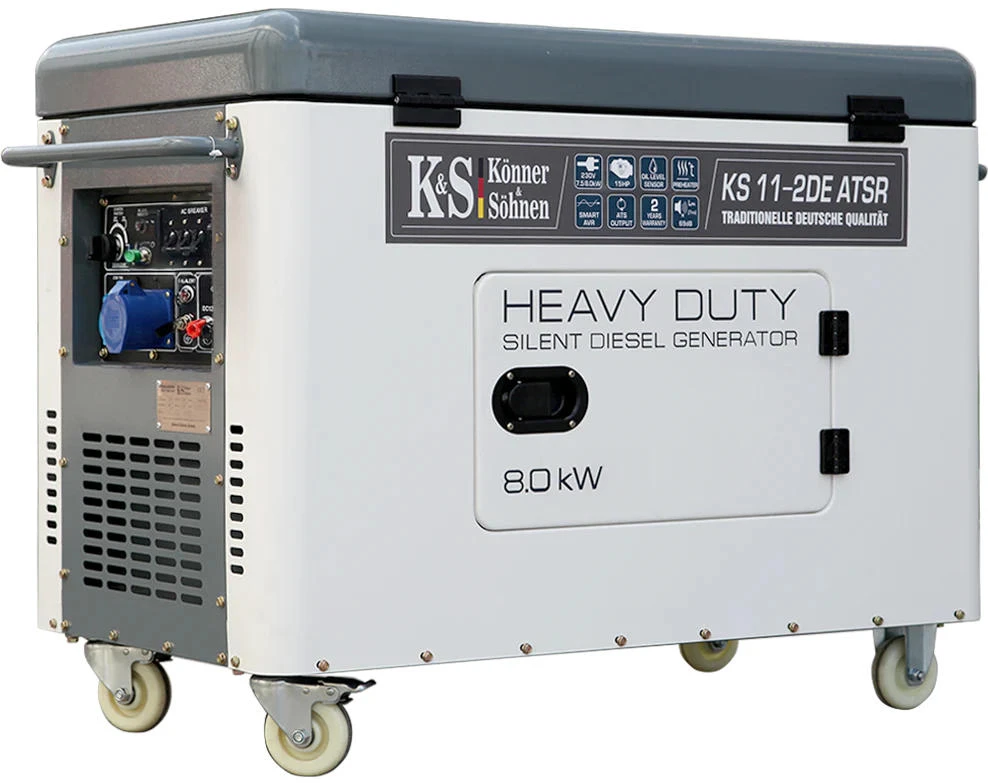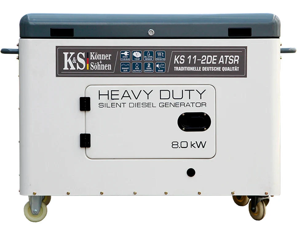 Дизельний генератор Konner&Sohnen KS 11-2DE ATSR — це потужне та надійне джерело резервного живлення з електростартером і функцією передстартового підігріву. Пристрій забезпечує до 8,0 кВт потужності, має всепогодній антивандальний кожух і сучасну LED-панель керування. Тиха робота (64 дБ на 7 м) у поєднанні з паливним баком 25 л гарантує тривалу автономну роботу.