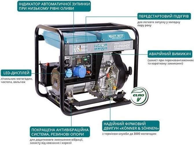 Генератор дизельний Konner&Sohnen KS 6100HDE (EURO V), 230В, 5.5/5.0кВт, електростартер, передстарто