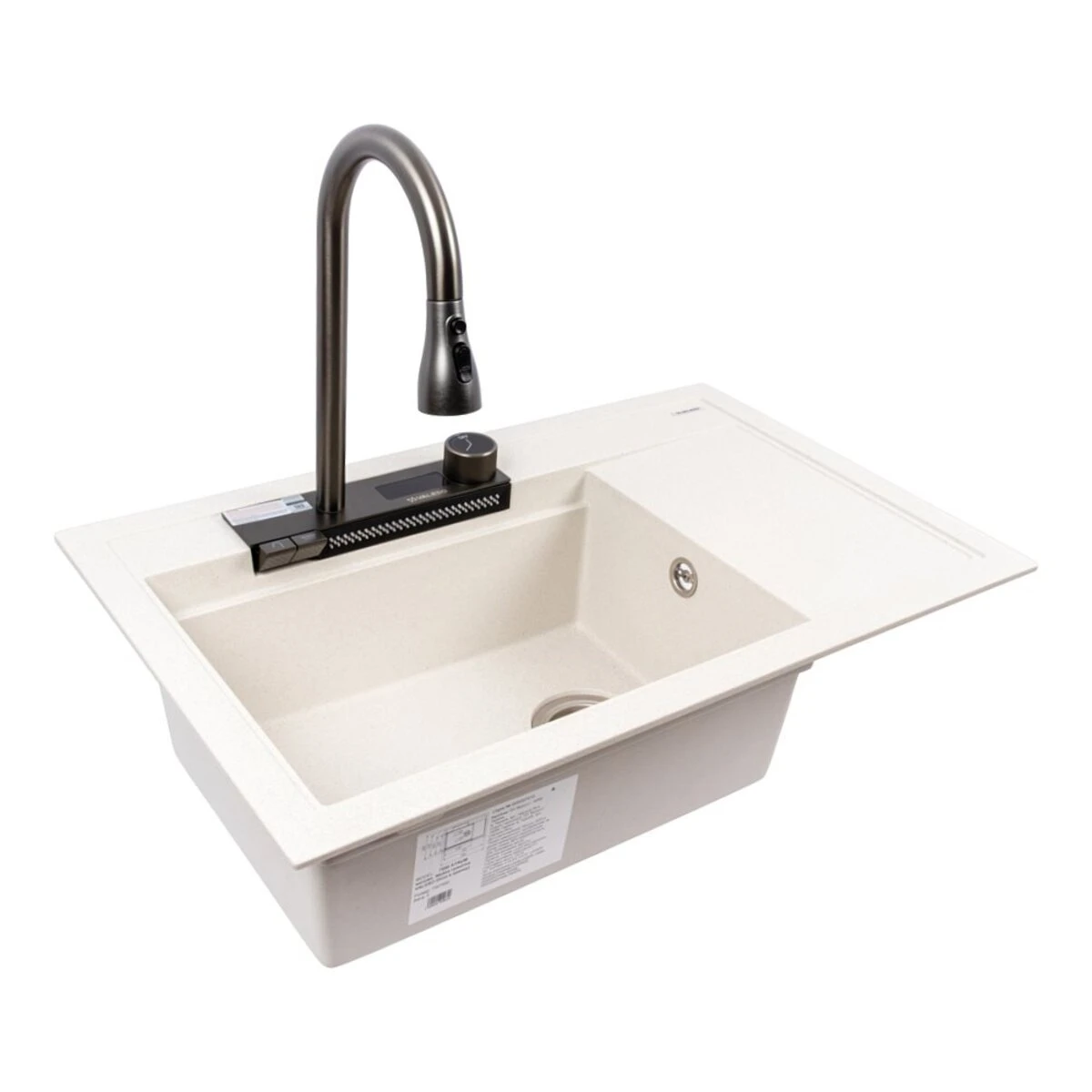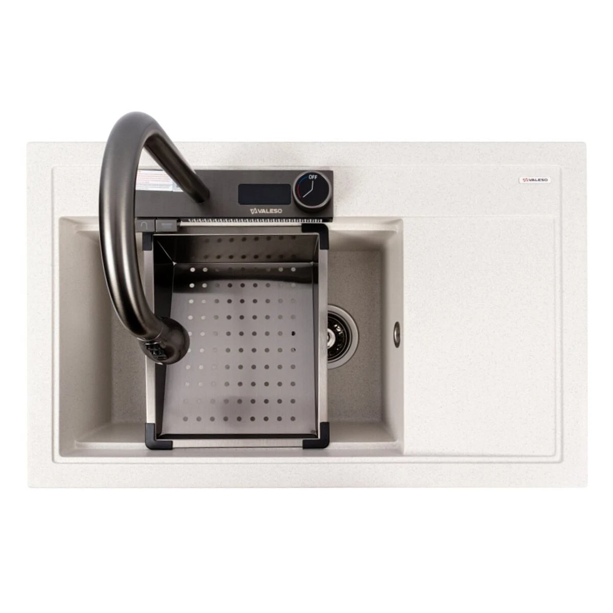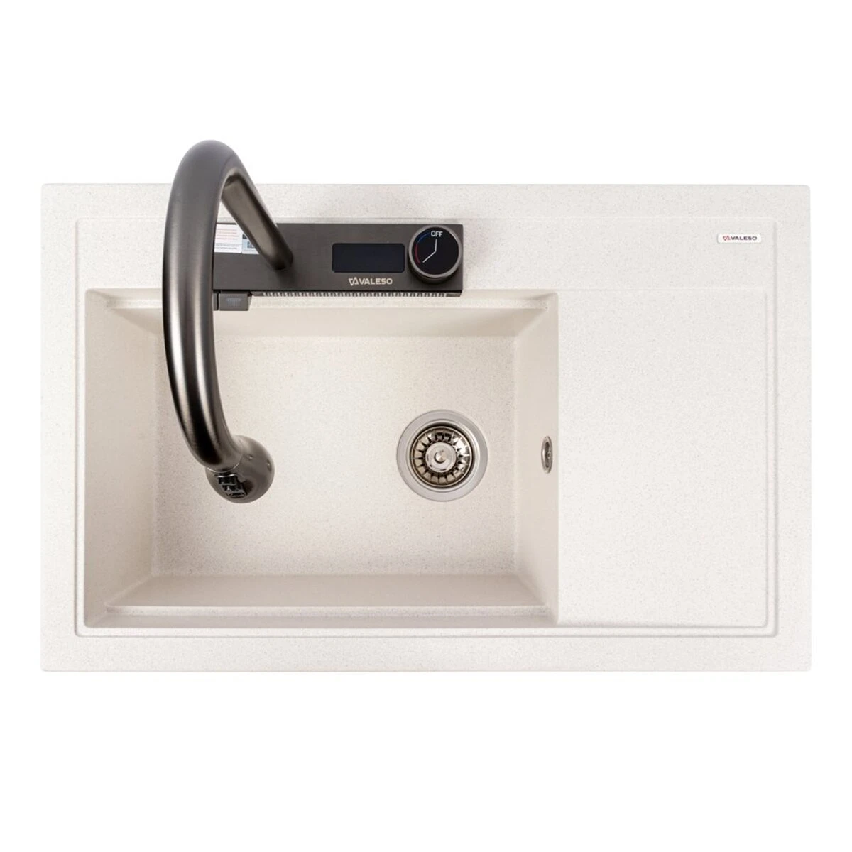 Гранітна мийка VALESO 7950 ATRUM у кольорі Білий в крапку— це сучасне поєднання стилю, функціональності та надійності. Виготовлена з високоякісного гранітного композиту, вона відзначається стійкістю до механічних пошкоджень, перепадів температур і впливу побутової хімії. Матова поверхня не лише додає вишуканості, а й легко очищується.