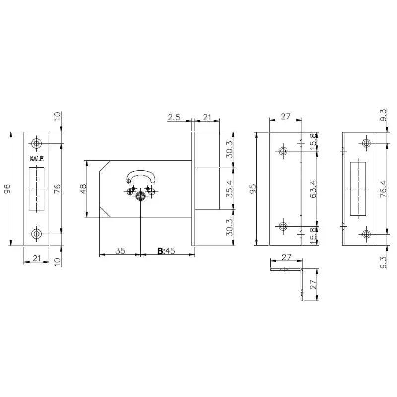 Замок KALE 156F можна поєднувати з декоративними накладками, петлями, бронепластинами та ручками у кольорах хром, нікель, антик або латунь. Завдяки стандартним монтажним розмірам модель легко інтегрується у дверне полотно без необхідності додаткової обробки. Сумісний із більшістю дверних фурнітур KALE.
