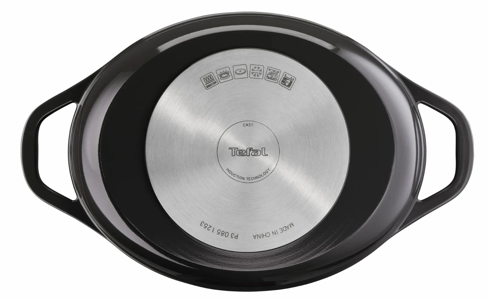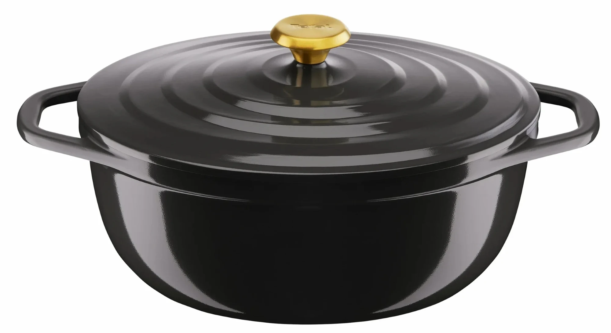 Каструля Tefal Air об’ємом 5,7 л виготовлена з литого алюмінію та має керамічне внутрішнє покриття для зручного щоденного приготування страв. Конструкція значно легша за класичні чавунні моделі, а кришка з конденсаційним ефектом допомагає зберігати соковитість інгредієнтів. Модель сумісна з усіма типами плит, витримує запікання в духовці до 250 °C та підтримує миття в посудомийній машині.
