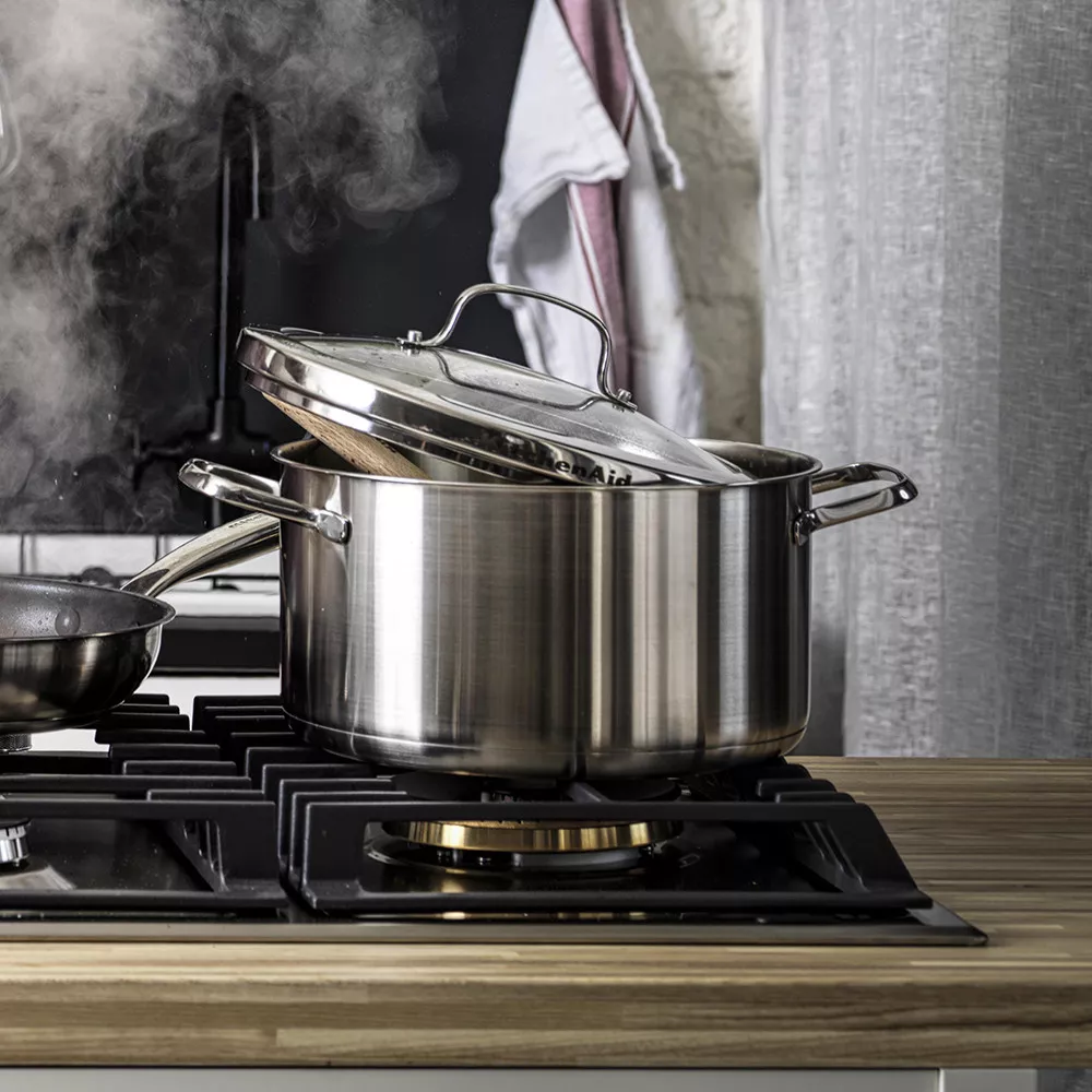 Каструля Proline 24 см 5,7 л з кришкою від KitchenAid - це надзвичайне поєднання функціональності та стилю. Це кухонний шедевр з унікальним дизайном, який виділяється культовими елементами KitchenAid. Край кришки, що тонко нагадує металевий край міксера KitchenAid, є не тільки естетичним акцентом, а й практичним рішенням, яке додає неповторний характер кожній страві.