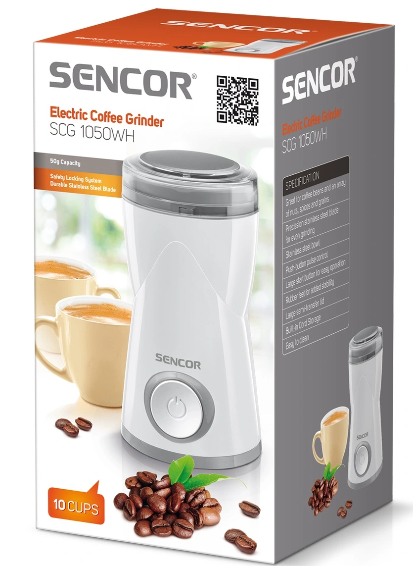 За допомогою кавомолки Sencor SCG 1050 потужністю 150 Вт надається можливість не тільки насолодитися відмінною кавою, а й ще подрібнювати волоські горіхи, злаки, насіння маку і спеції. Кавомолка компактна, легка в експлуатації, має стильний дизайн, корпус виконаний з міцного пластику. Це надійне кухонне обладнання прослужить протягом тривалого часу без найменших нарікань або неполадок.
