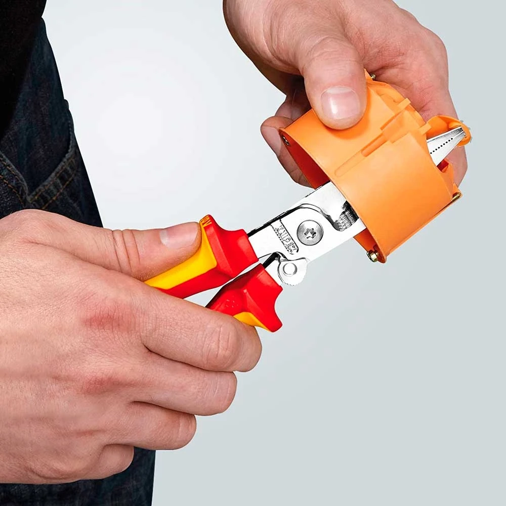 Кліщі багатофункціональні KNIPEX 13-96-200 призначені для виконання електромонтажних робіт під напругою. Інструмент поєднує кілька функцій в одному корпусі та дозволяє виконувати різання, зачищення і обтиск. Діелектричні рукоятки мають VDE-випробування для роботи до 1000 В. Компактна конструкція дозволяє зменшити кількість інструментів під час виконання монтажних робіт.