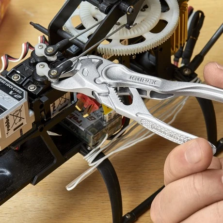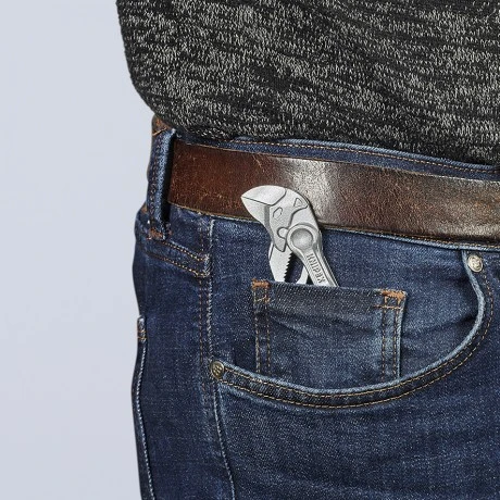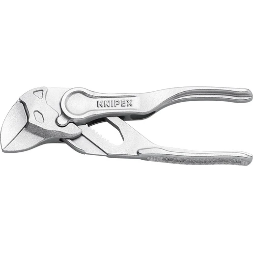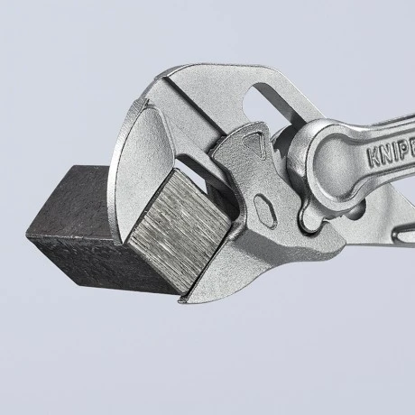 Кліщі переставні KNIPEX 86 04 100 — найкомпактніший інструмент серії довжиною 100 мм з гладкими губками. Замінює ключі до 21 мм завдяки 10 позиціям регулювання кнопкою. Гладкі паралельні губки не залишають слідів на хромованих чи м’яких деталях. Виготовлено з хромованадієвої сталі з хромованим покриттям. Вага лише 70 г.