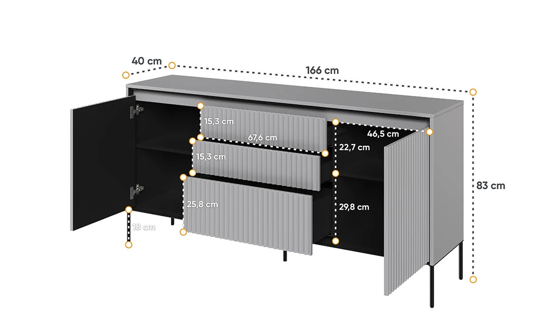 - 3 шухляди по центру, 2 дверей з боків: Забезпечують багатофункціональний простір для зберігання.