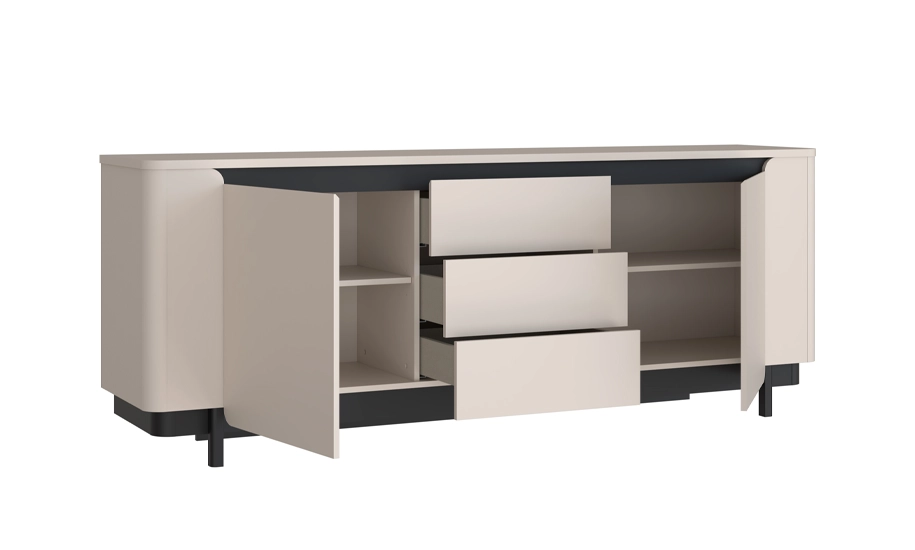 Завдяки своїм габаритам (ширина 204,9 см, висота 77,9 см, глибина 44,8 см) він вміщує значну кількість речей, але при цьому не перевантажує інтер’єр. Модель оснащена двома дверцятами з боків і трьома висувними шухлядами в центрі, що робить його універсальним рішенням для зберігання. У бічних секціях передбачені полиці, зручні для упорядкованого розміщення посуду, текстилю, документів чи речей повсякденного використання.