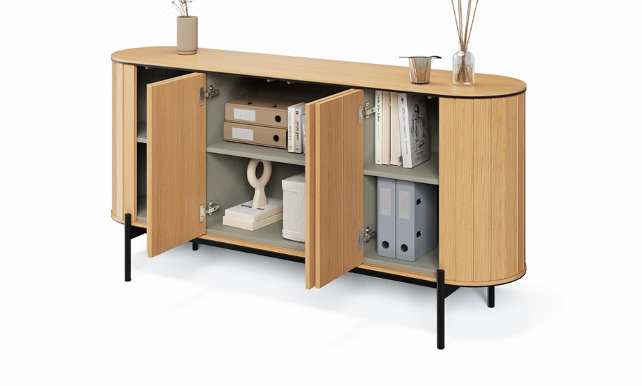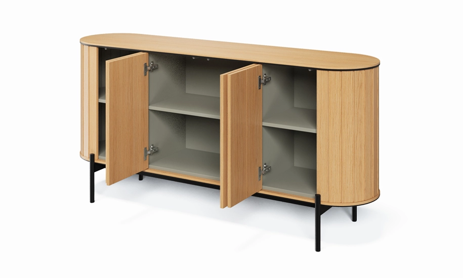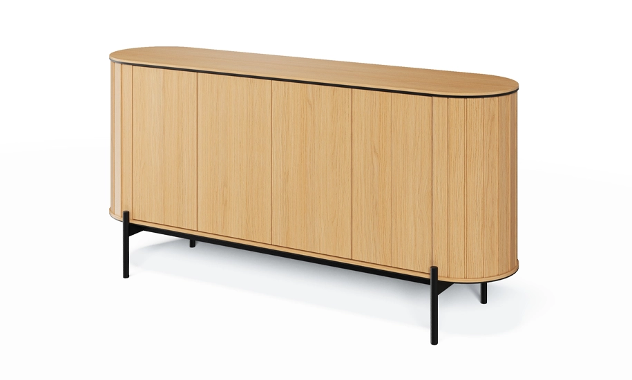 Комод 4-дверний 168 см ROTTO дуб - це функціональний центр уваги для вітальні чи open space. Завдяки елегантній заокругленій формі, теплим деревним відтінкам і рифленим вертикальним акцентам, він виглядає не як просто комод, а як витончене дизайнерське рішення.