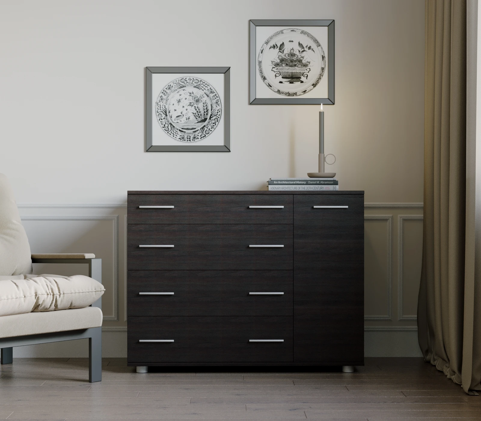 Комод Еверест К-3 — це сучасне рішення для організації зберігання речей у спальні. Завдяки лаконічному дизайну та універсальному кольору венге темний, він гармонійно доповнить як класичний, так і сучасний інтер’єр, додаючи йому елегантності.