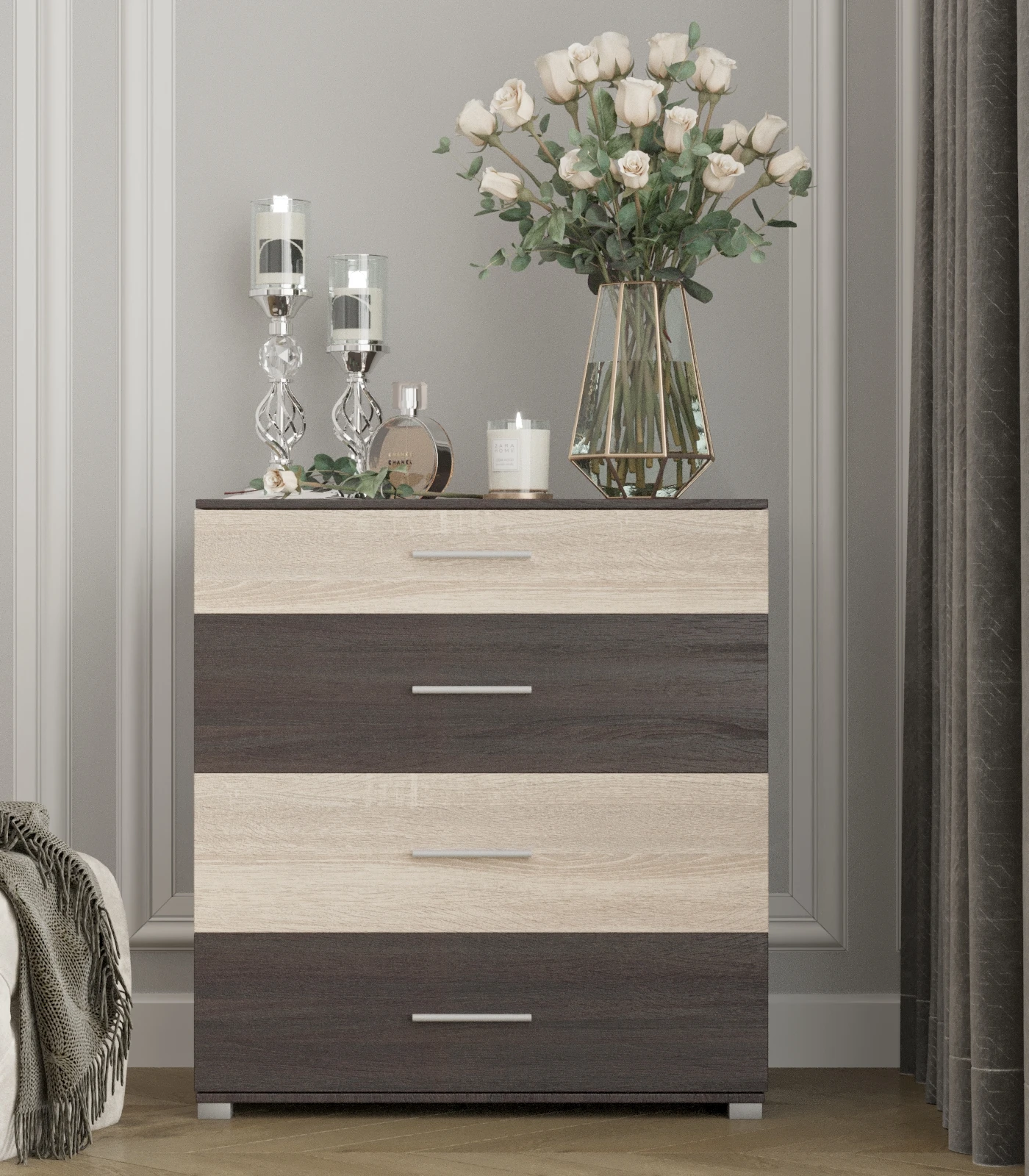 Шукаєте стильне та функціональне рішення для зберігання речей? Комод Еверест на 4 ящики стане ідеальним доповненням до вашого інтер'єру. Завдяки сучасному дизайну в кольорах венге та дуба молочного, він не тільки виглядає елегантно, але й забезпечує максимальну зручність у використанні. Телескопічні направляючі ящиків гарантують легкість відкриття та закриття, що робить його практичним вибором для будь-якої кімнати.