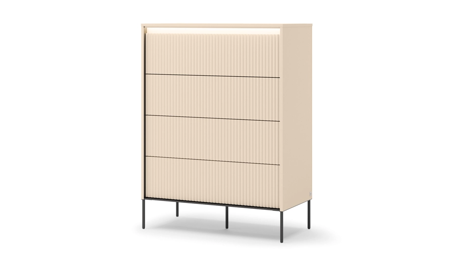 Високий комод Trend із чотирма шухлядами — це стильне рішення для сучасного інтер'єру, де важливі й функціональність, і дизайн. Рифлені фасади в ніжному бежевому кольорі надають моделі текстурності та характеру, а вбудоване LED-підсвічування створює м'яке світло, що підкреслює елегантність ліній і додає простору атмосфери затишку.
