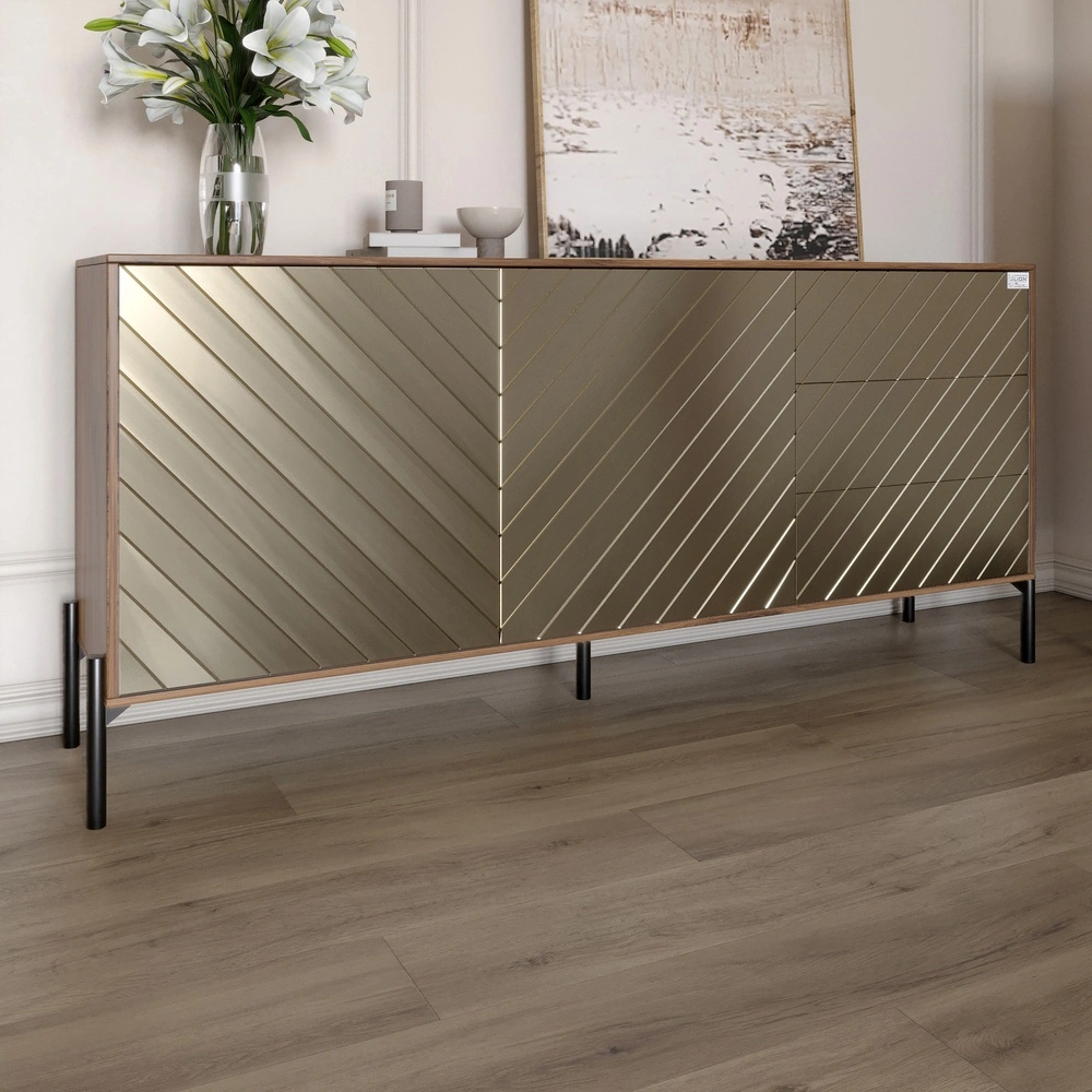 Откройте для себя комод LION, который станет идеальным дополнением к вашему дому. Благодаря современному дизайну и элегантным черным металлическим ножкам этот комод не только поражает своим видом, но и обеспечивает практичность в использовании. Его стильный дуб Ливорно и перламутровый металлик придают интерьеру изысканность и современность.
