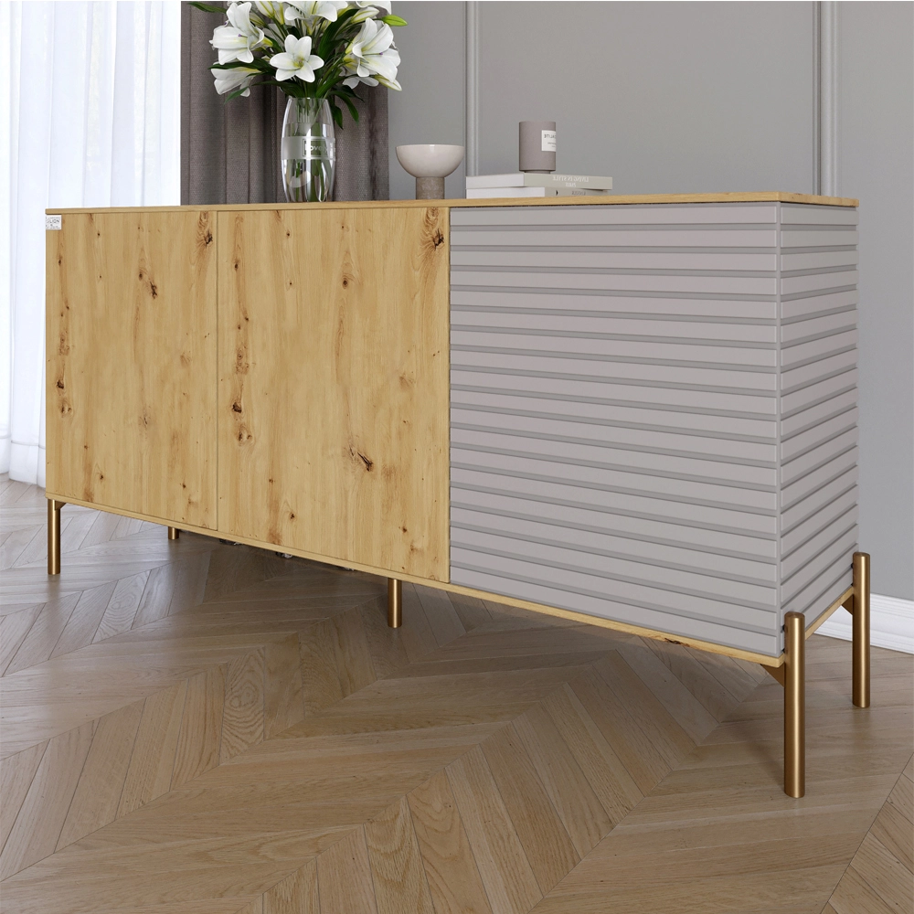 Комод закритий у вітальню на золотих металевих ніжках LION Грей 154x38x76,5 см Дуб Артизан/Кашемір (