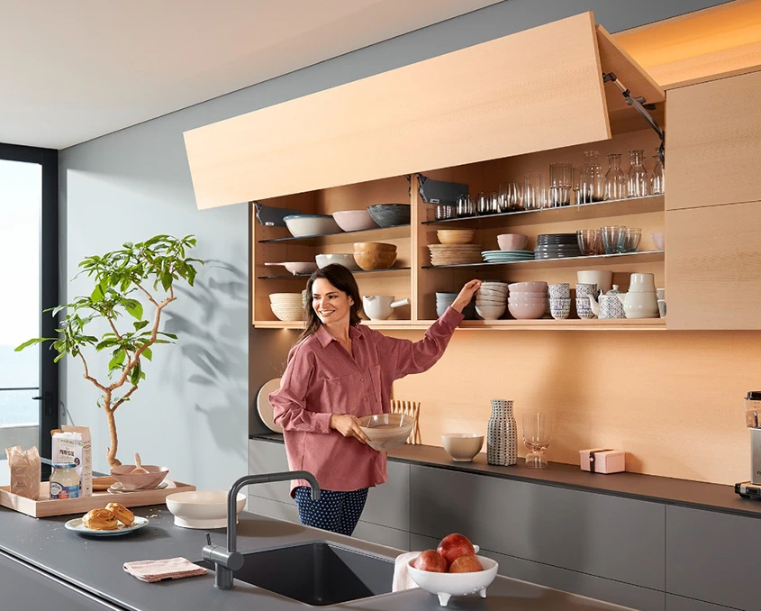 Aventos HF підходить для фасадів різного стилю — з деревини, скла або їх комбінацій. Механізм не порушує зовнішнього вигляду меблів, адже система кріпиться приховано, зберігаючи естетику інтер’єру. Також передбачено інтеграцію з електричною системою Servo-Drive, яка забезпечує автоматичне відкривання дверцят легким натисканням — ідеальне рішення для сучасних кухонь, де функціональність поєднується з комфортом.