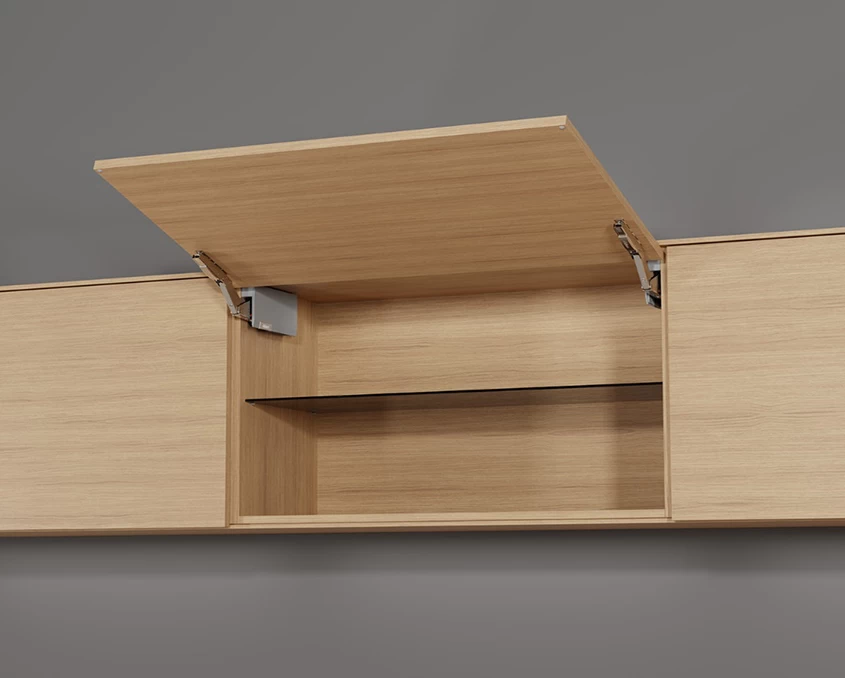 - Зручність в експлуатації — фасад легко відкривається і фіксується в будь-якому положенні, дозволяючи працювати з шафою без необхідності тримати дверцята.