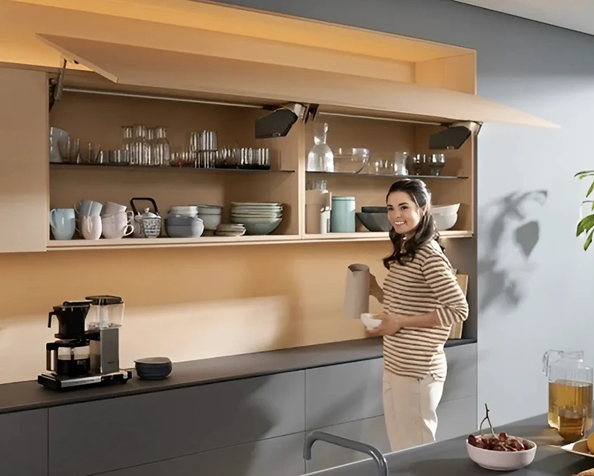 Aventos HS від Blum — підйомний механізм, ідеальний для великих та важких фасадів, які піднімаються і плавно нахиляються над корпусом шафи. Підходить для широких верхніх шаф, надаючи зручний доступ до їхнього вмісту без необхідності відкривати дверцята убік.