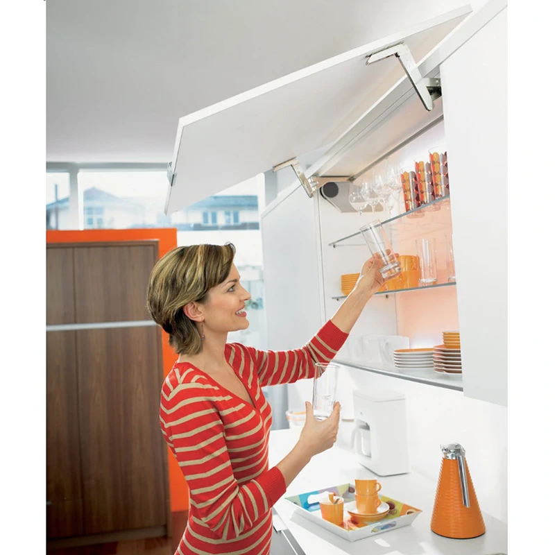 Aventos HS від Blum — підйомний механізм, ідеальний для великих та важких фасадів, які піднімаються і плавно нахиляються над корпусом шафи. Підходить для широких верхніх шаф, надаючи зручний доступ до їхнього вмісту без необхідності відкривати дверцята убік.