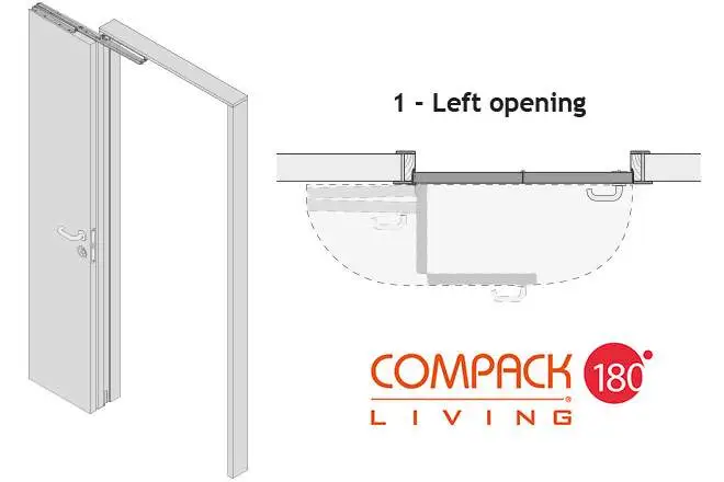 Спосіб відкриття: Поворотно-зсувні двері Compack легко складаються, а потім або здійснюють обертальний рух і займають місце уздовж стіни, або фіксуються під кутом 90 ° до неї