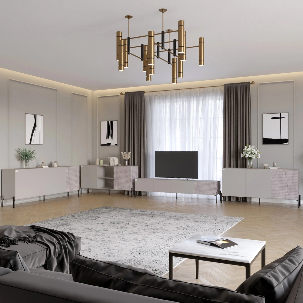 Комплект мебели для гостиной LION Грей – это идеальное сочетание элегантности и практичности, что станет отличным дополнением к вашему интерьеру. Благодаря модульной конструкции, вы сможете легко адаптировать мебель под свои нужды, комбинируя разные элементы. Стильные металлические ножки не только обеспечивают устойчивость, но и придают комплекту современный вид, а рельефные детали на фасадах придают оригинальности и динамики. Изготовлен из высококачественного ЛДСП SWISS KRONO, этот комплект мебели отличается долговечностью и стойкостью к механическим повреждениям и влаге. Минималистичный дизайн без внешних ручек и кромка, защищающая края, делают мебель еще более привлекательной. Выберите комплект LION Грей для создания уютной атмосферы в вашем доме, где каждый элемент гармонично дополняет интерьер в стиле минимализм, лофт или модерн.