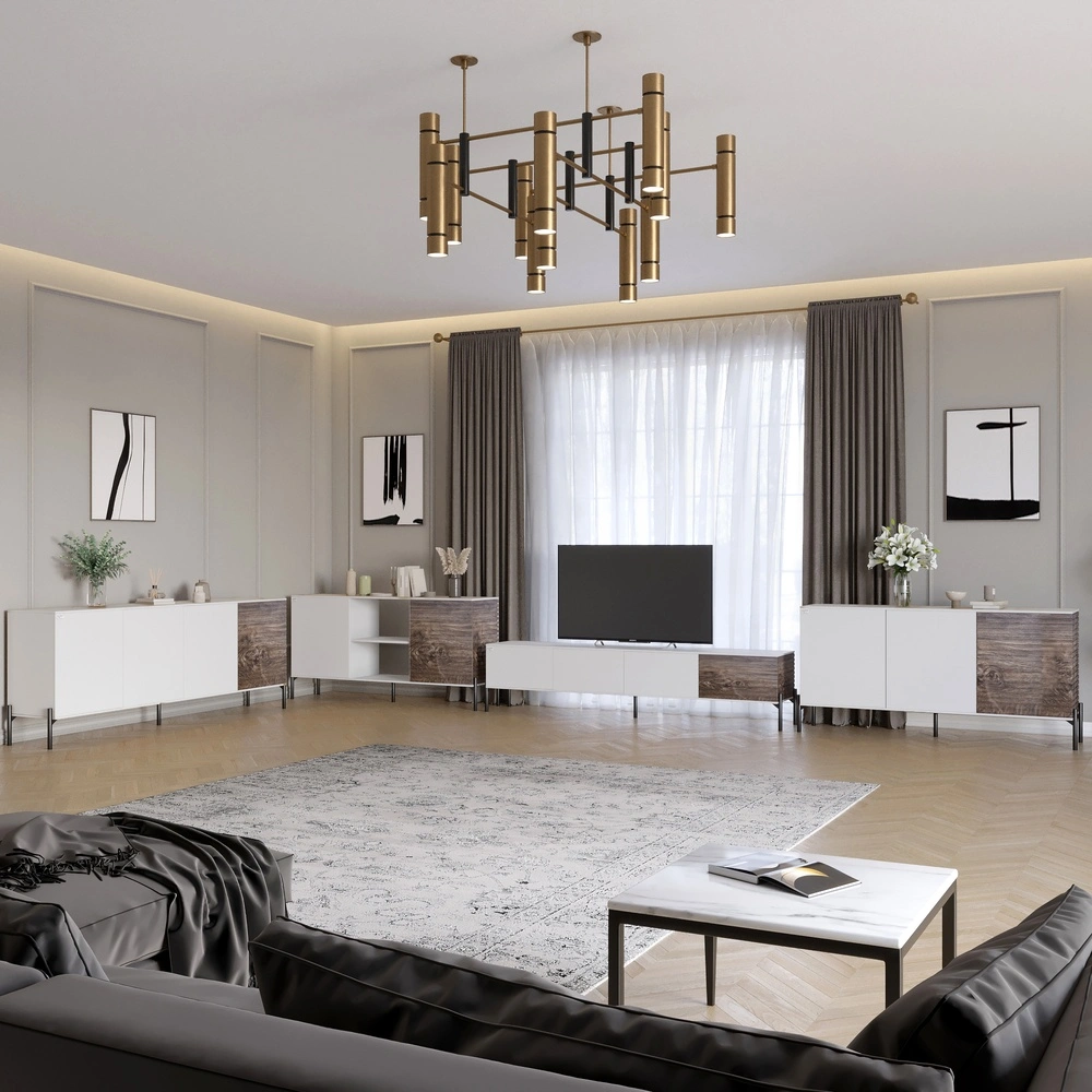 Комплект мебели для гостиной LION Грей станет идеальным дополнением вашего интерьера, сочетая элегантный дизайн с практичностью. Благодаря металлическим ножкам, эта конструкция является не только легкой, но и стабильной, а рельефные детали на фасадах привносят оригинальность в ваш дом. В комплект входят комод, открытый и закрытый комоды, а также тумба для телевизора, позволяющая создавать гармоничное пространство в стиле минимализма, лофт или модерн. Изготовленный из высококачественного ЛДСП SWISS KRONO, комплект обеспечивает долговечность и эстетичный вид. Устойчивость к механическим повреждениям, влаге и высоким температурам гарантирует, что ваша мебель остается в безупречном состоянии на много лет. Модульная структура позволяет комбинировать элементы в соответствии с вашими потребностями, а минималистическая фурнитура придает изделию современный вид, делая его идеальным выбором для любого пространства.