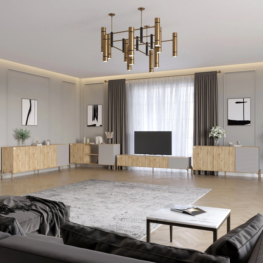 Внесите стиль и удобство в свой дом с комплектом мебели LION Грей. Этот модульный комплект, состоящий из комода, открытого и закрытого комода, а также тумбы для телевизора, сочетает в себе элегантный дизайн и высокую функциональность. Металлические ножки придают ему современный вид и обеспечивают стабильность, а рельефные детали на фасаде придают динамики вашему интерьеру. Идеально подходит для стилей минимализма, лофта или модерна.