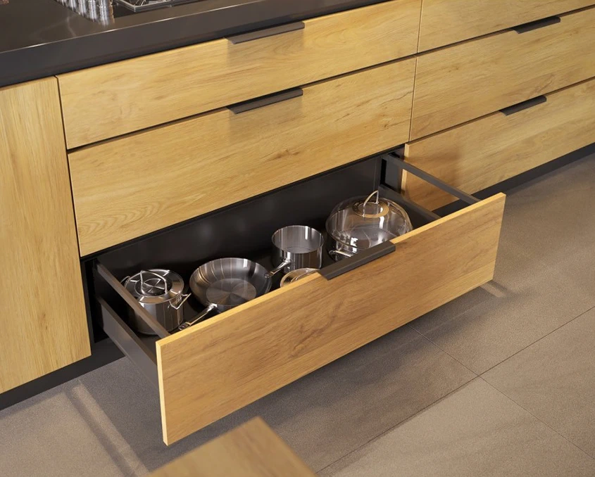 Комплект висувної шухляди GTV MB PRO з висотою боковини 199 мм і довжиною напрямних 550 мм в антрацитовому кольорі — це ідеальне рішення для зберігання великогабаритних або важких речей. Завдяки міцній конструкції, повному висуванню, синхронізованому механізму та доводчику, система забезпечує плавну, безшумну роботу та витримує навантаження до 40 кг.