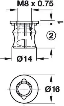Корпус стяжки Stablofix з буртиком, для товщини деталі від 18 мм, виготовлений з цинкового сплаву. Діаметр корпусу стяжки - 14 мм, глибина свердління- 14,5 мм, відстань від центра отвора для болта до верхньої кромки корпуса стяжки- 9мм.
