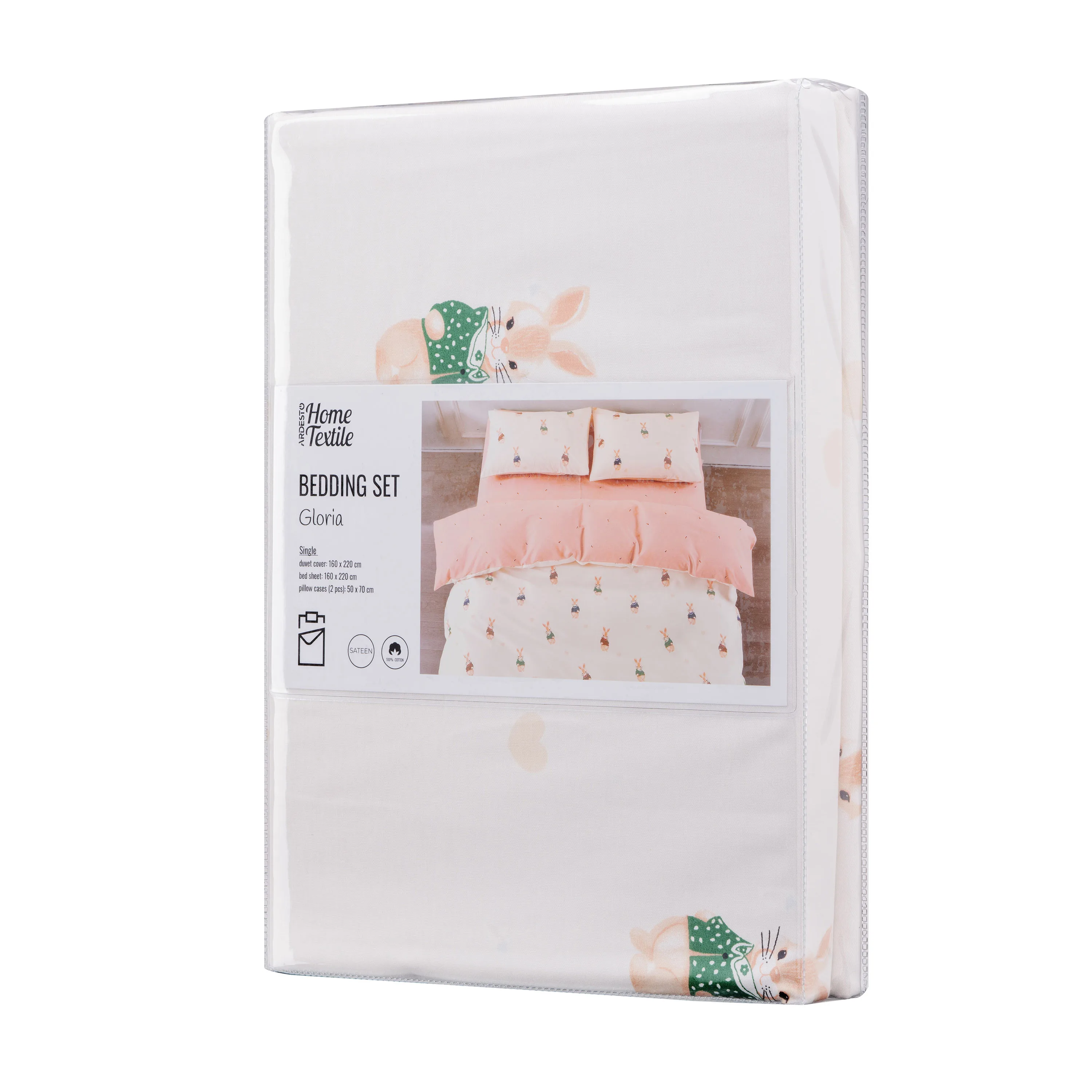 Комплект постільної білизни Gloria – це поєднання витонченого дизайну й безкомпромісної якості. Вироблена зі 100 % бавовняного сатину щільністю 200 ТС, постіль подарує винятковий комфорт і затишок. М’яка тканина ніжно пестить шкіру, забезпечуючи її дихання і створюючи відчуття свіжості та легкості. Дизайн із милим принтом додає спальному місцю особливого шарму.